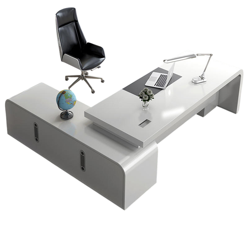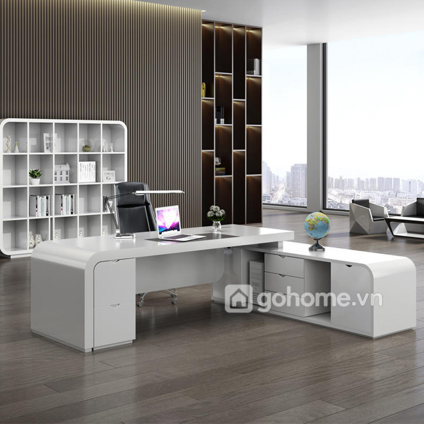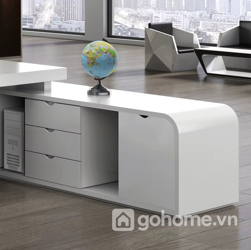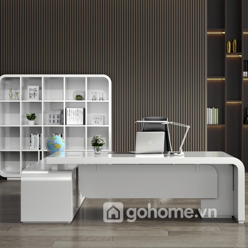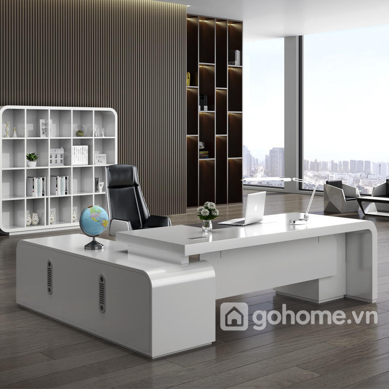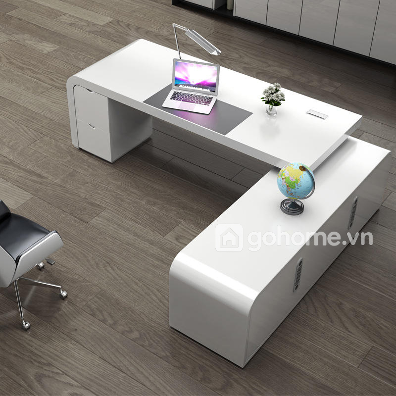 Thiết kế ấn tượng với màu trắng tinh tế, góc bo mềm mại, kết hợp cùng kiểu dáng chữ L gọn gàng đã biến chiếc bàn này trở thành tâm điểm trong bất kỳ văn phòng nào. Đây không chỉ là bàn làm việc – mà còn là biểu tượng của một nhà lãnh đạo đẳng cấp.