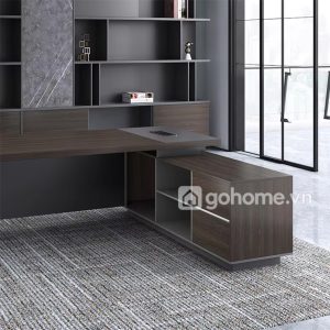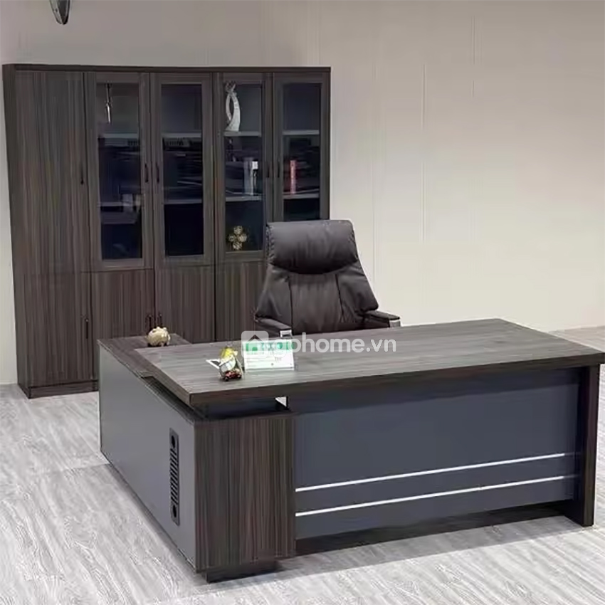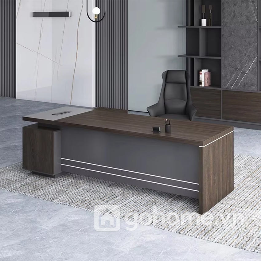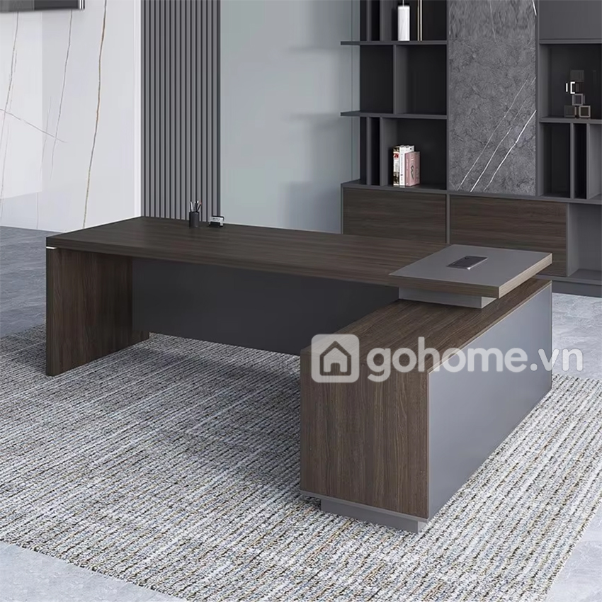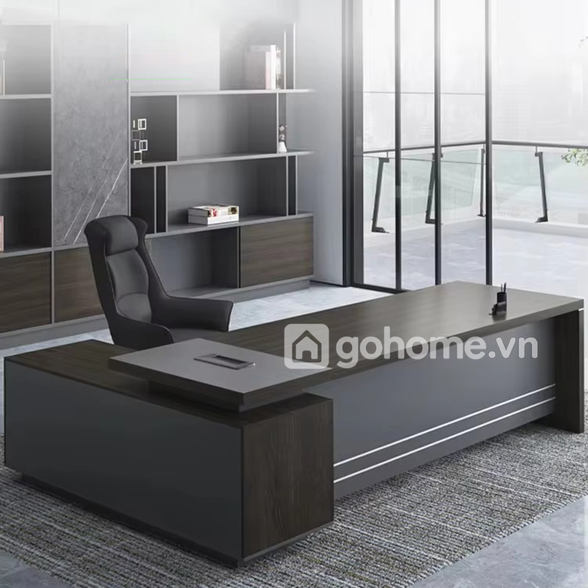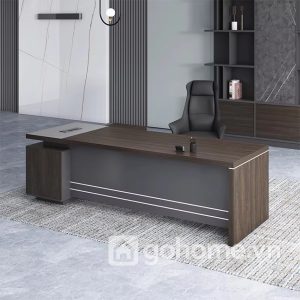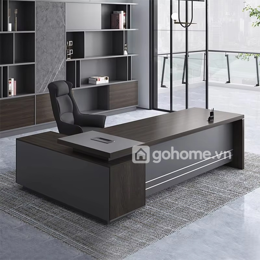 Phong cách thiết kế theo hình khối sắc sảo, bo góc dứt khoát, kết hợp hài hòa giữa tone màu đen – ghi – vân gỗ tối mang đến cảm giác trầm tĩnh nhưng cực kỳ cuốn hút. Đây là mẫu bàn được rất nhiều CEO, giám đốc điều hành, nhà quản lý cấp cao lựa chọn nhờ vào tính linh hoạt và chuẩn mực thẩm mỹ cao.
