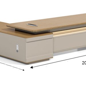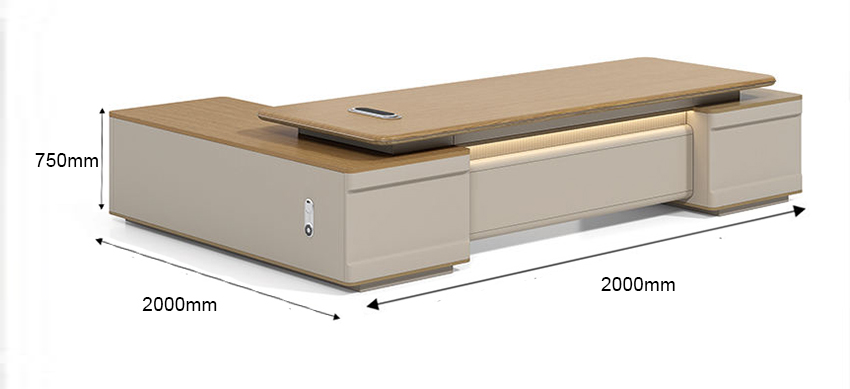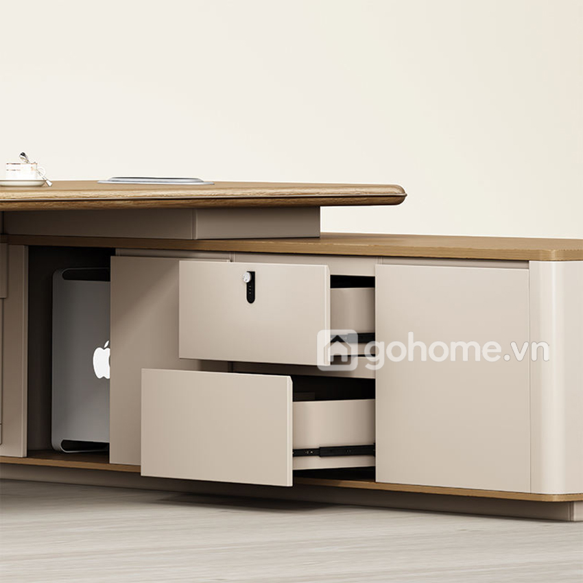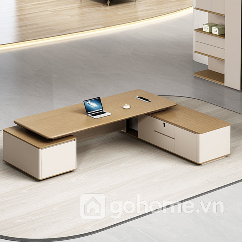 Chiếc bàn giám đốc cao cấp này là sự giao thoa tinh tế giữa thiết kế tối giản và cấu trúc công thái học thông minh. Mặt bàn rộng rãi với các cạnh được bo cong mềm mại giúp hạn chế va chạm khi sử dụng. Tone màu gỗ sáng kết hợp phần thân và hộc bàn màu kem trung tính không chỉ mang lại sự tinh tế mà còn giúp không gian trở nên sáng sủa, thoáng đãng hơn.