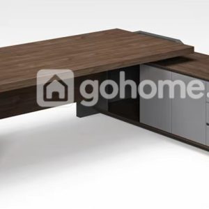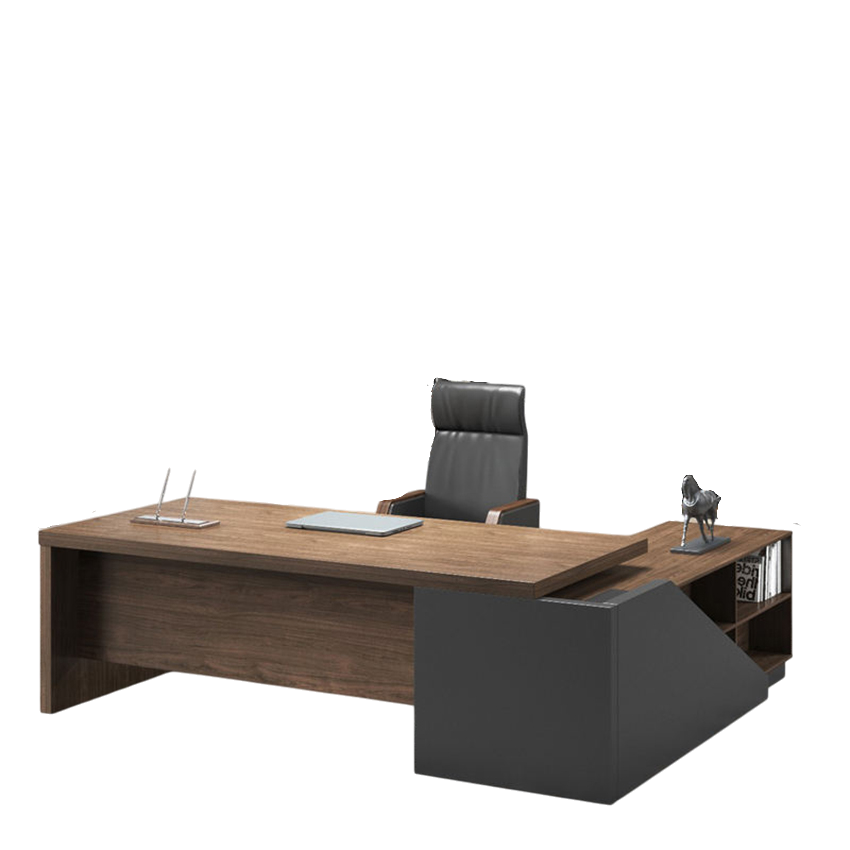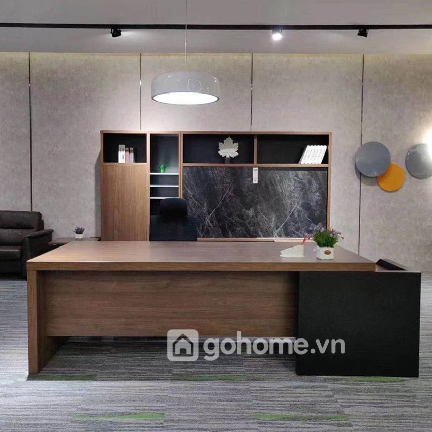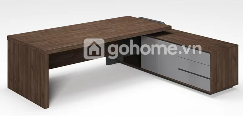 Tổng thể chiếc bàn mang phong cách hiện đại với thiết kế chữ L tinh tế, cấu trúc khối mạnh mẽ, mặt bàn rộng rãi và bề thế. Gam màu gỗ nâu trầm kết hợp đen than sang trọng, mang lại cảm giác trầm ổn nhưng không nặng nề, dễ phối hợp cùng nhiều phong cách nội thất văn phòng.