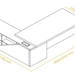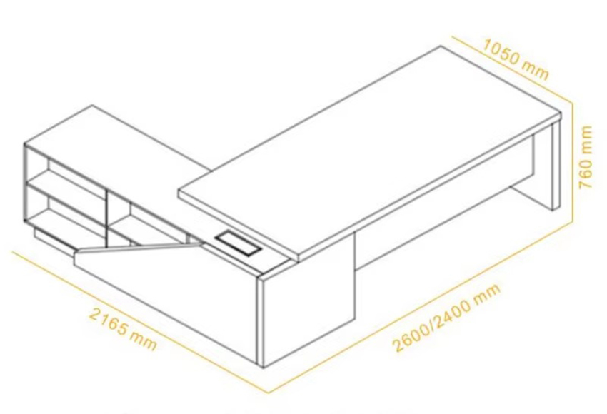 Thiết kế bàn được tối giản đến từng chi tiết, với các đường cắt sắc nét, góc bo vuông mạnh mẽ thể hiện sự quyết đoán, rõ ràng trong quản trị. Cấu trúc chữ L giúp người sử dụng có không gian thao tác rộng rãi, dễ dàng di chuyển giữa các vị trí làm việc mà không bị giới hạn không gian.