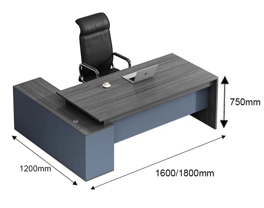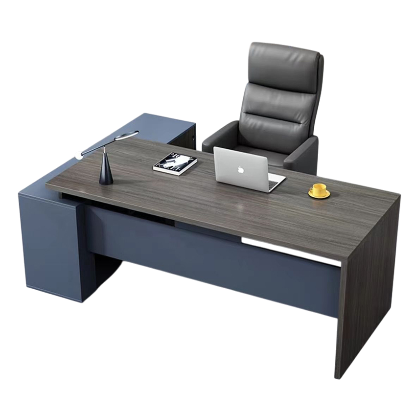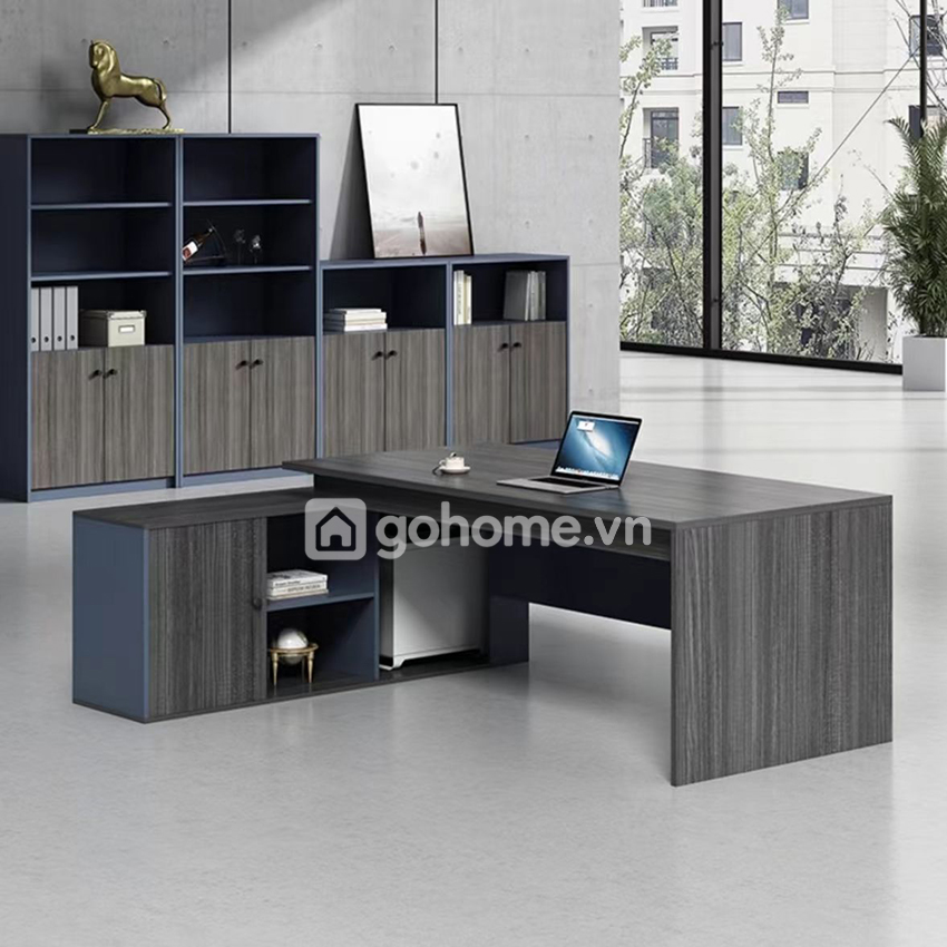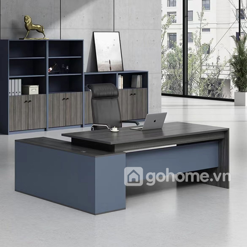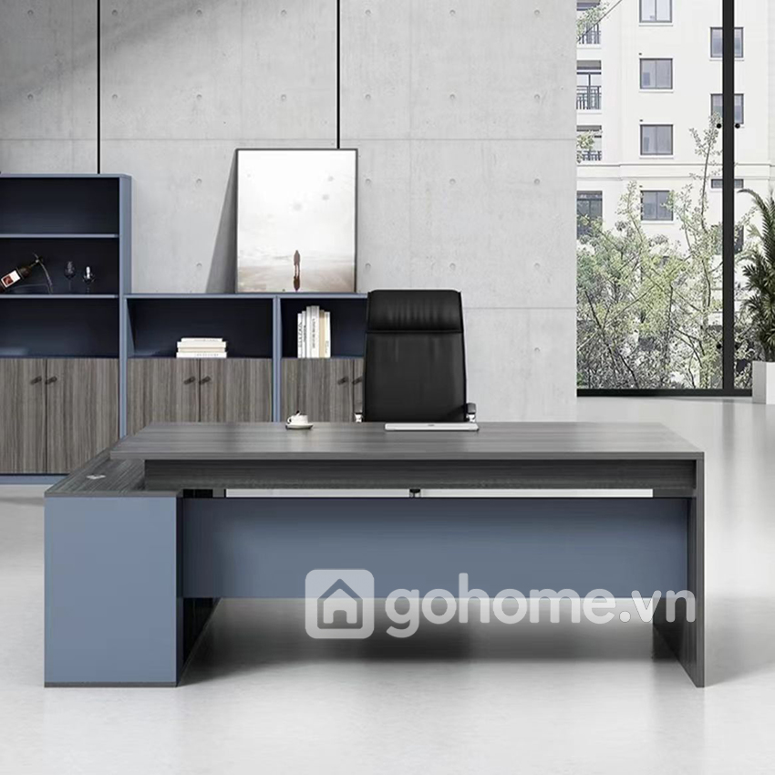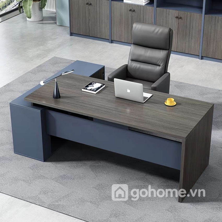 Chiếc bàn trong ảnh được phối màu gỗ xám ghi nhã nhặn kết hợp khối chân sơn xanh navy nổi bật – vừa tạo điểm nhấn ấn tượng vừa giữ được sự trang nhã phù hợp môi trường công sở chuyên nghiệp.