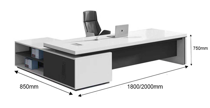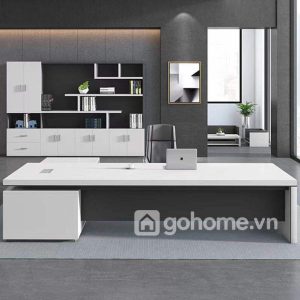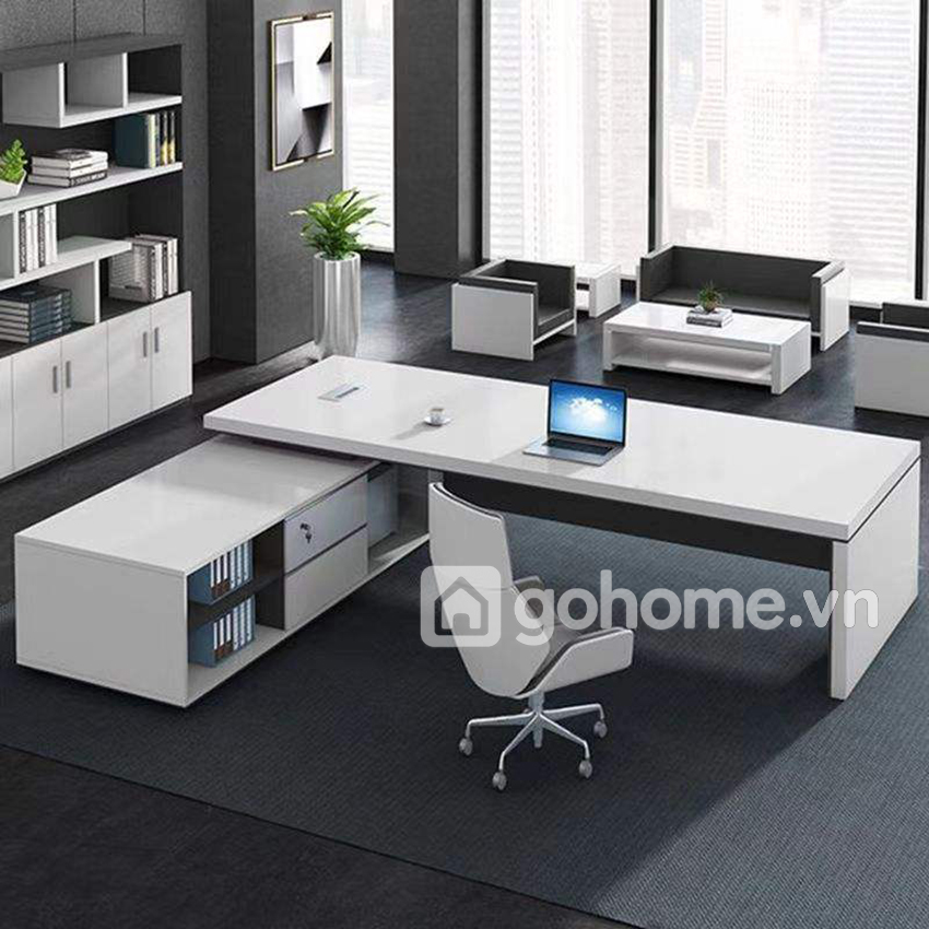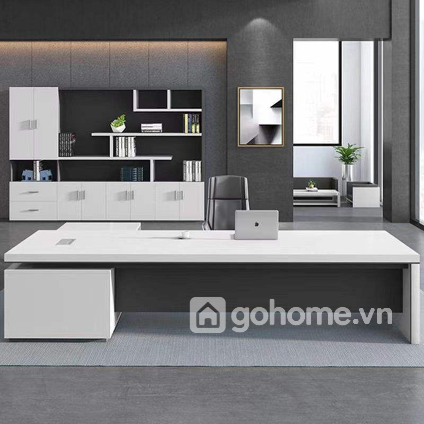Thiết kế bàn theo xu hướng tối giản – ít chi tiết thừa – đường nét gãy gọn, kết hợp phần chân chữ L khối đặc chắc chắn, tạo nên một tổng thể vững vàng, đầy đẳng cấp. Mặt bàn trắng phủ bóng kết hợp cùng các điểm nhấn đen xám trung tính tạo hiệu ứng tương phản thị giác mạnh mẽ, nhưng vẫn giữ được sự tinh tế cần thiết cho phòng làm việc lãnh đạo.