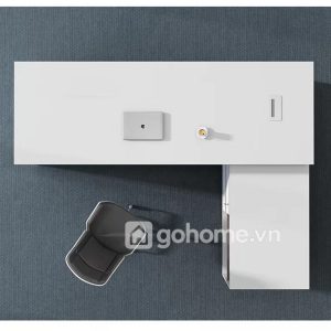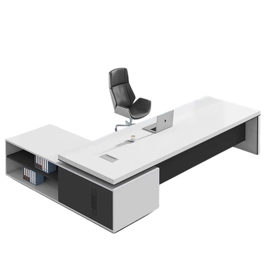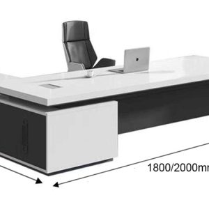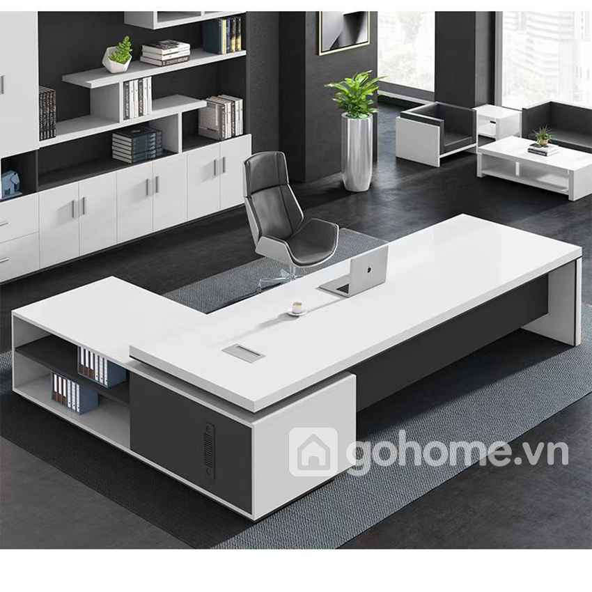 Sản phẩm là mẫu bàn giám đốc chữ L phá cách, thiết kế nổi khối ấn tượng với mặt bàn phủ trắng bóng phối đen trung tính, phù hợp hoàn hảo cho các văn phòng theo phong cách minimal – hiện đại – high-tech.