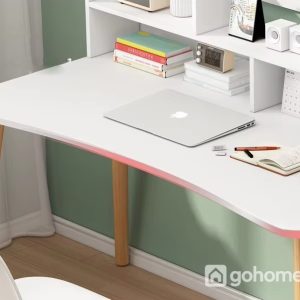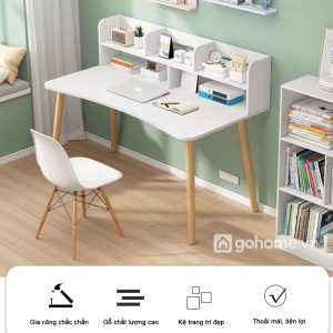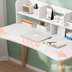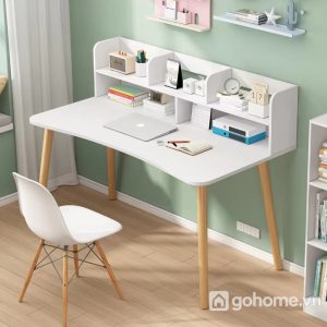 Điểm nhấn chính là kệ nhỏ phía trên bàn – nơi bạn có thể để sách, hộp bút, đồ trang trí hay đồng hồ để bàn. Nhờ đó, mọi thứ luôn trong tầm tay mà vẫn giữ mặt bàn gọn gàng, sạch sẽ.