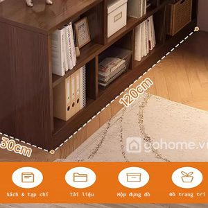 Phần kệ sách được bố trí ngay dưới mặt bàn, chia thành nhiều ngăn tiện lợi giúp sắp xếp mọi thứ ngăn nắp.