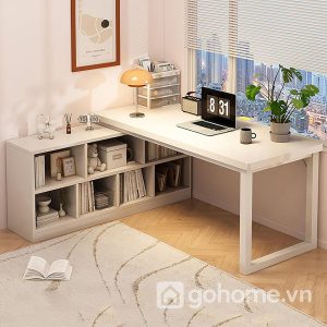 Bàn học kết hợp kệ sách phía dưới được thiết kế thông minh với phần kệ lưu trữ liền khối ngay dưới mặt bàn, giúp bạn có thể dễ dàng sắp xếp sách vở, tài liệu, hộp bút, phụ kiện học tập hoặc đồ trang trí nhỏ xinh.