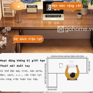 Thiết kế chữ L hiện đại tối ưu hóa không gian góc phòng, mở rộng khu vực sử dụng mà vẫn giữ được cảm giác thông thoáng. Mặt bàn rộng rãi, cho phép người dùng thoải mái bố trí laptop, đèn học, sách vở và vật dụng cá nhân.