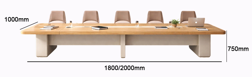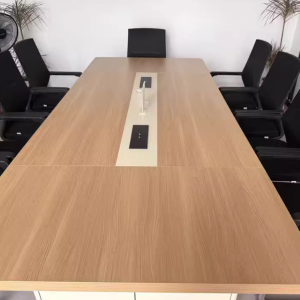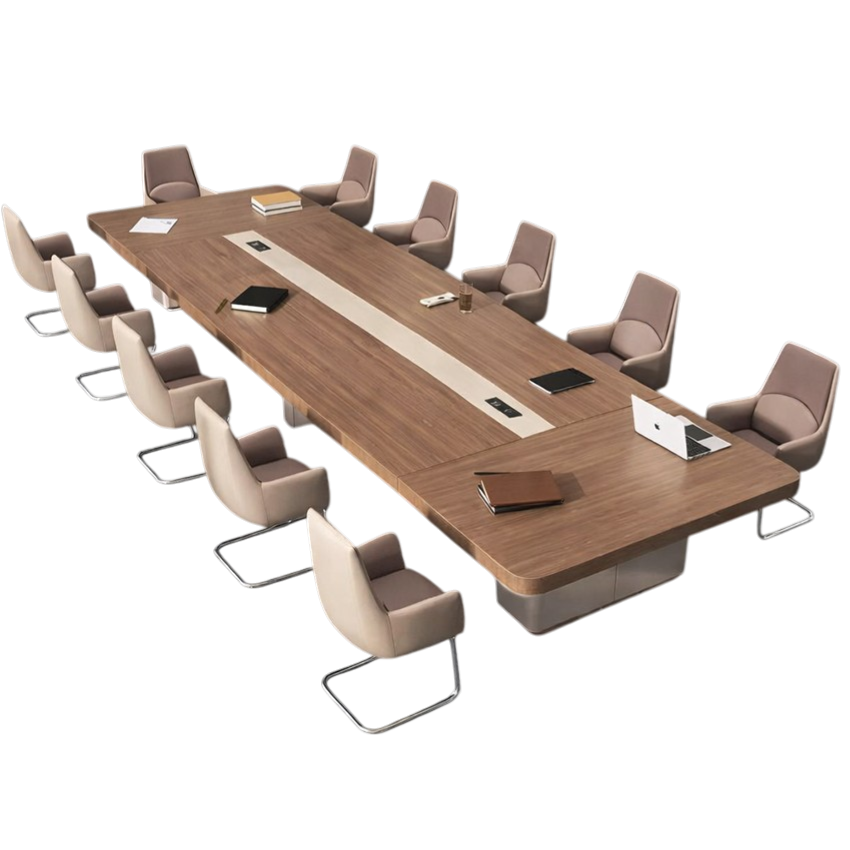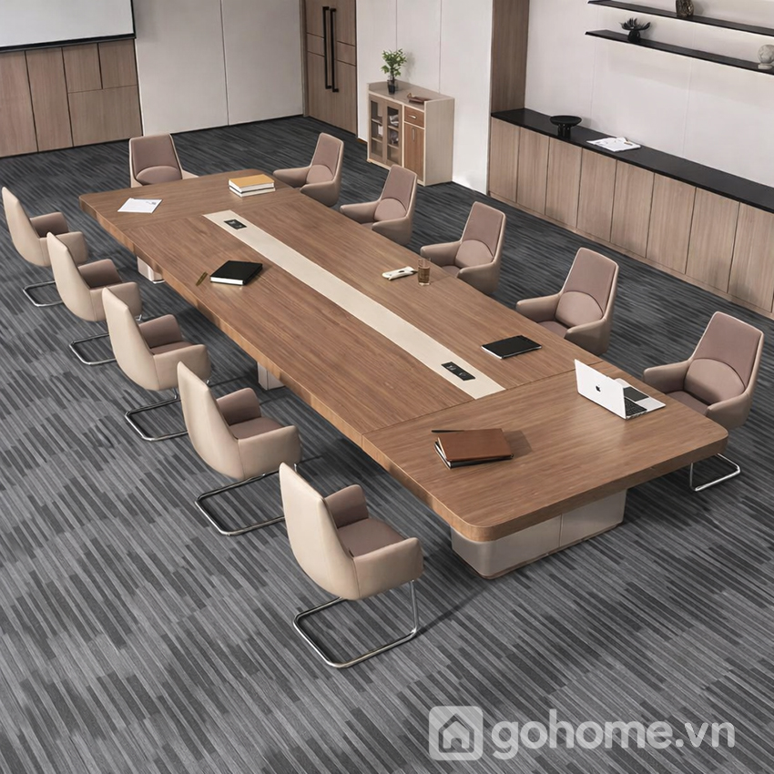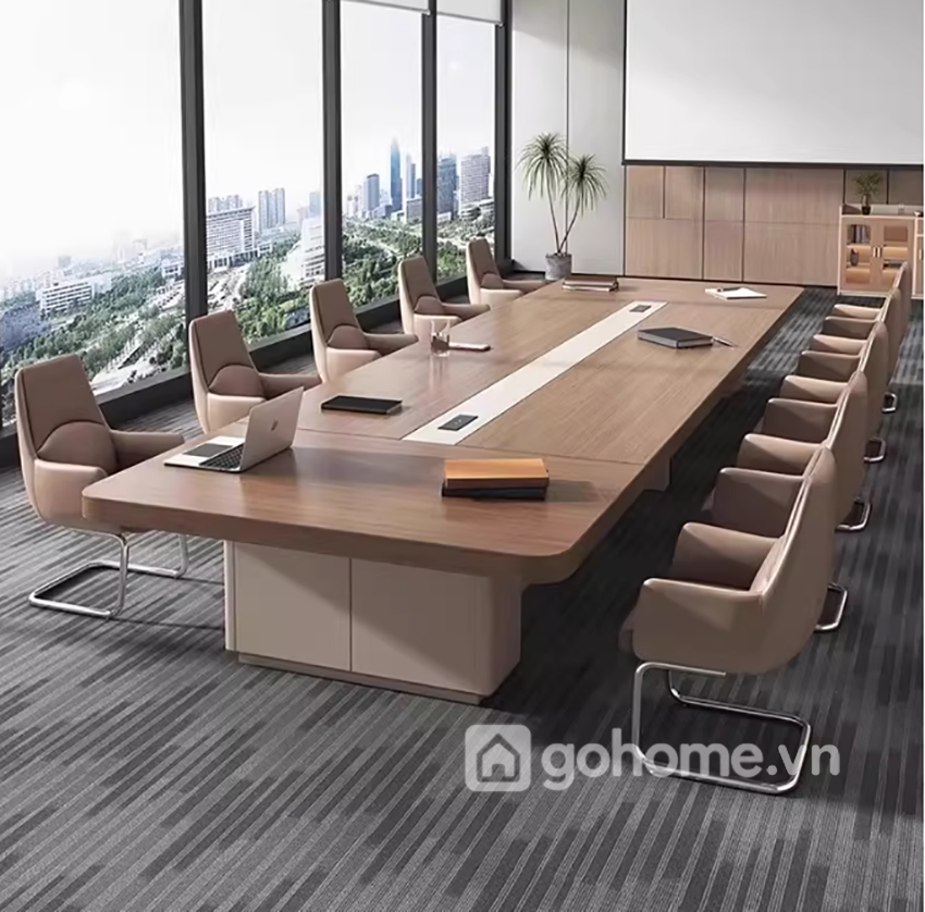 Tông màu gỗ tự nhiên mang lại cảm giác ấm cúng nhưng vẫn giữ được vẻ sang trọng cần thiết cho môi trường doanh nghiệp. Thiết kế mặt bàn dài giúp tối ưu số lượng chỗ ngồi, phù hợp cho các cuộc họp nhóm, họp dự án hoặc họp hội đồng quản trị.