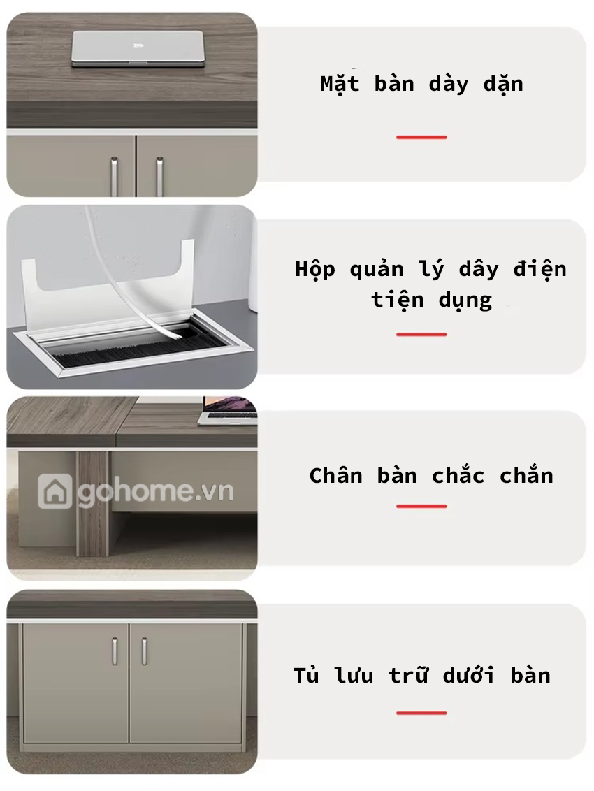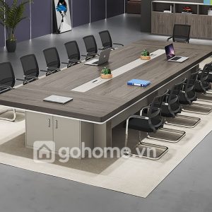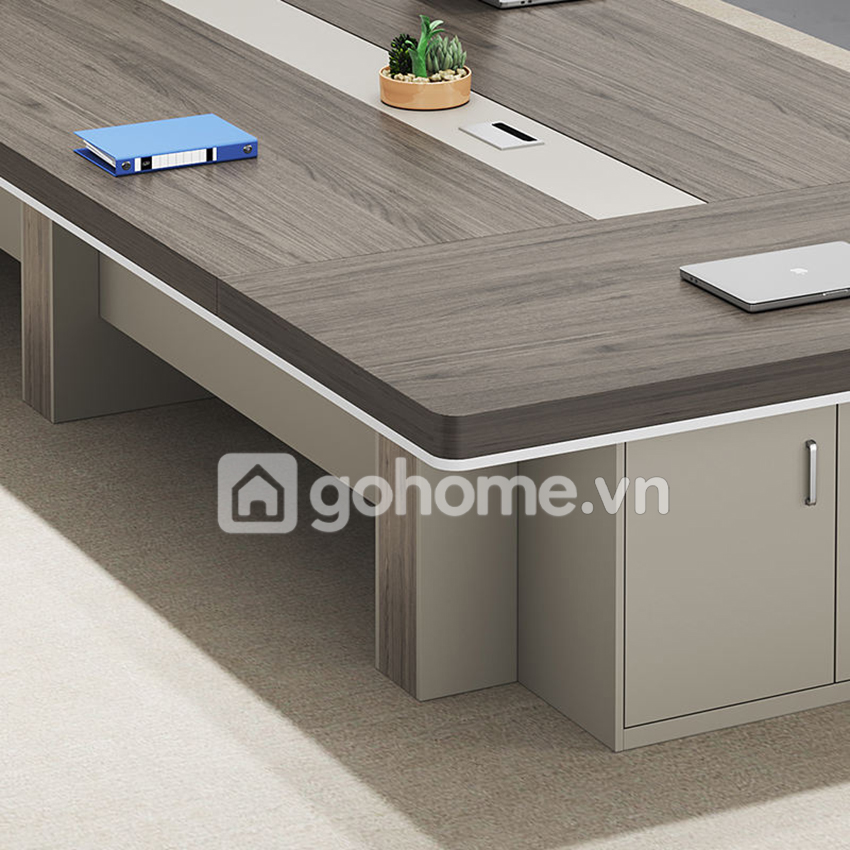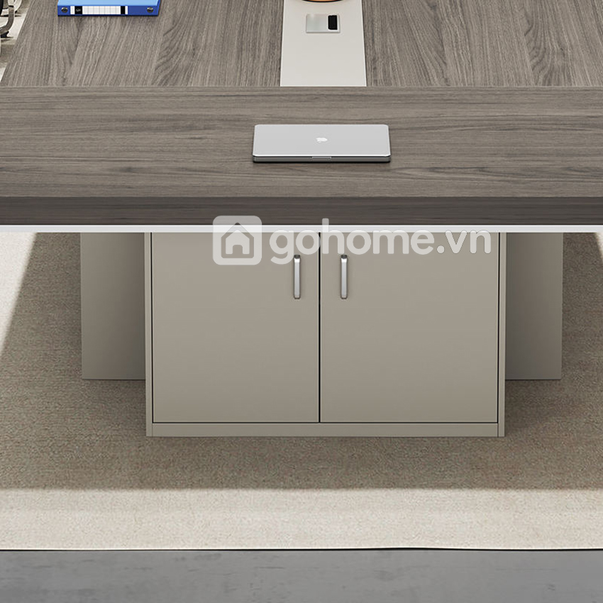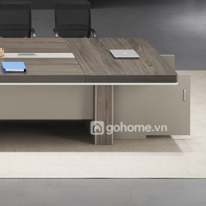 Điểm nổi bật nhất của chiếc bàn họp đa năng có tủ bên dưới chính là sự tích hợp thông minh giữa bàn và tủ. Phần thân bàn được thiết kế thành các khối tủ kín bên dưới, vừa đóng vai trò nâng đỡ mặt bàn, vừa là khu vực lưu trữ tài liệu, thiết bị, dây điện… cực kỳ tiện lợi. Nhờ đó, phòng họp luôn gọn gàng – sạch sẽ – tối ưu diện tích.