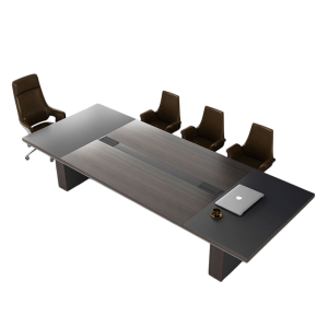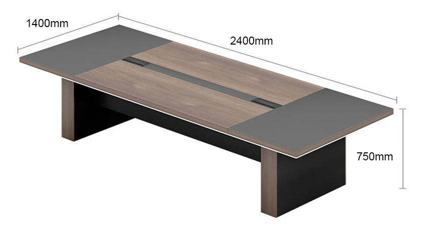 Chiếc bàn họp gỗ công nghiệp thiết kế sang trọng này nổi bật với sự tối giản trong đường nét, nhưng lại đậm chất hiện đại và quyền lực nhờ cách phối màu và bố cục thông minh. Tone gỗ nâu xám đậm chủ đạo được kết hợp cùng mảng màu đen nhám ở hai đầu bàn tạo hiệu ứng thị giác mạnh mẽ – vừa uy nghiêm, vừa sang trọng.