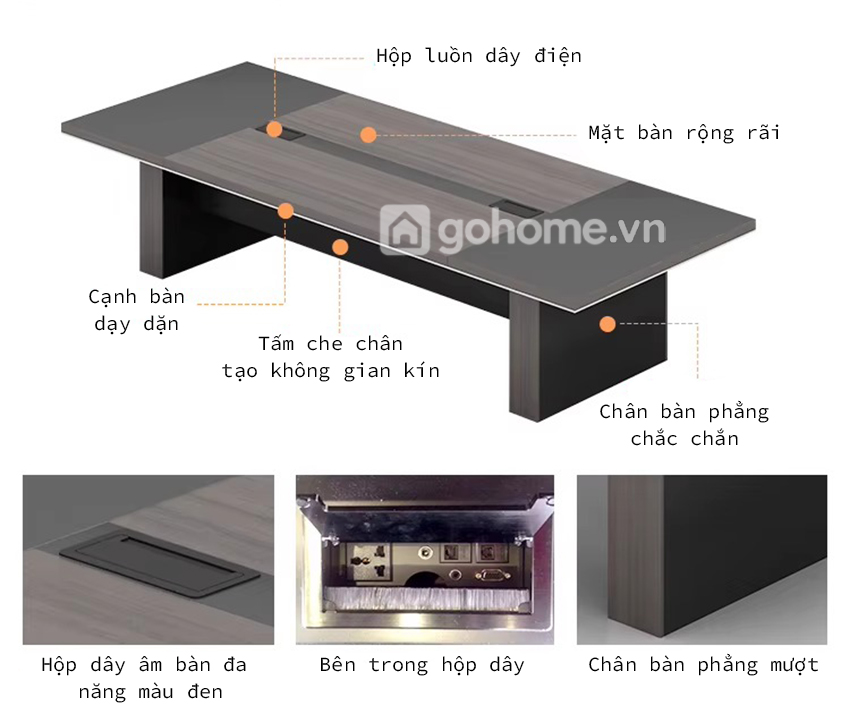 Tất cả các cổng đều ẩn dưới nắp trượt tinh tế, giúp giữ mặt bàn luôn gọn gàng, không dây nhợ rối rắm. Cực kỳ phù hợp với các buổi họp online, chia sẻ màn hình, thuyết trình dự án.