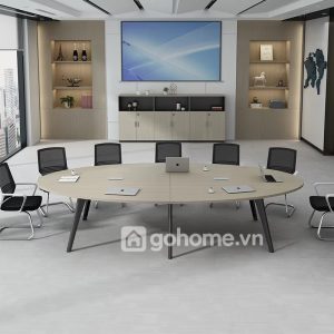 Bàn có hình dáng oval (bầu dục), các đường nét được bo mềm mại, giảm tối đa các góc cạnh sắc nhọn. Kiểu dáng này không chỉ tăng độ an toàn khi di chuyển trong phòng họp, mà còn tạo nên sự dễ chịu thị giác và tâm lý thân thiện cho người sử dụng.