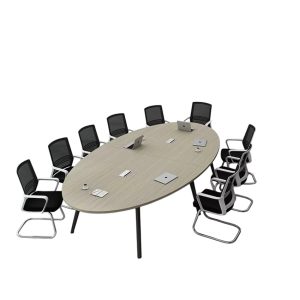Bàn có hình dáng oval (bầu dục), các đường nét được bo mềm mại, giảm tối đa các góc cạnh sắc nhọn. Kiểu dáng này không chỉ tăng độ an toàn khi di chuyển trong phòng họp, mà còn tạo nên sự dễ chịu thị giác và tâm lý thân thiện cho người sử dụng.