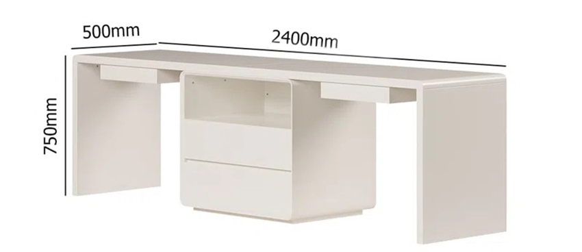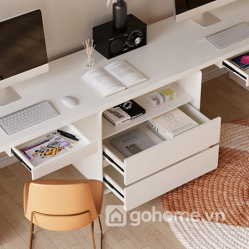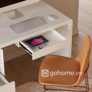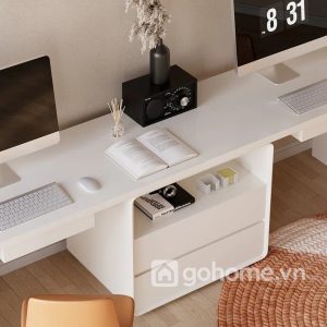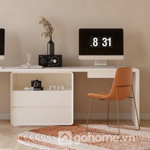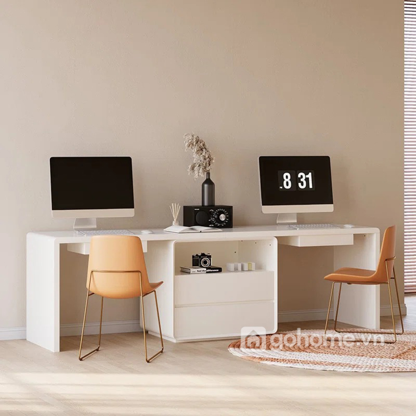 Phong cách tối giản hiện đại (minimalism) với gam màu trắng tinh tế giúp không gian trở nên thoáng đãng, nhẹ nhàng nhưng vẫn rất chuyên nghiệp. Đây là mẫu bàn cực kỳ phù hợp cho phòng làm việc tại nhà, văn phòng nhỏ, phòng học chung cho con hoặc không gian coworking tại gia.