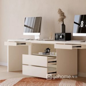 Bàn có kết cấu liền khối chắc chắn, mặt bàn dài cho phép hai người làm việc song song mà vẫn có không gian riêng tư. Phần hộc tủ trung tâm vừa đóng vai trò ngăn cách nhẹ nhàng, vừa là nơi lưu trữ tài liệu chung như hồ sơ, sổ sách, thiết bị văn phòng.