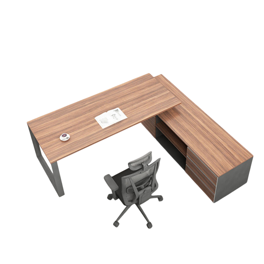 Bàn làm việc cho lãnh đạo chân sắt hiện đại là mẫu nội thất kết hợp hoàn hảo giữa phong cách tối giản và công năng đa dạng, phù hợp với các văn phòng hiện đại ngày nay. Thiết kế chữ L vừa tạo không gian làm việc rộng rãi, vừa giúp phân tách khu vực xử lý công việc và khu vực lưu trữ/tài liệu, nâng cao hiệu suất và sự tập trung.