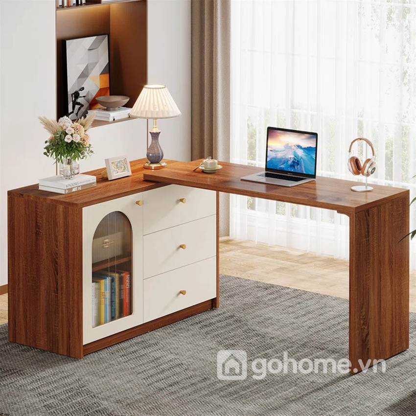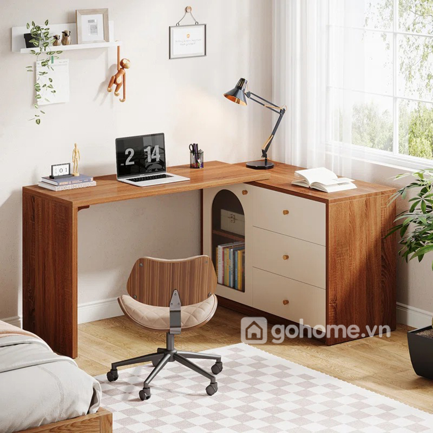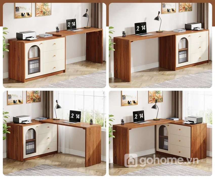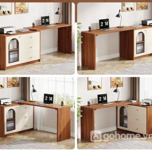 Khác với bàn chữ L cố định truyền thống, mẫu bàn này cho phép xoay linh hoạt khối tủ, giúp bạn: