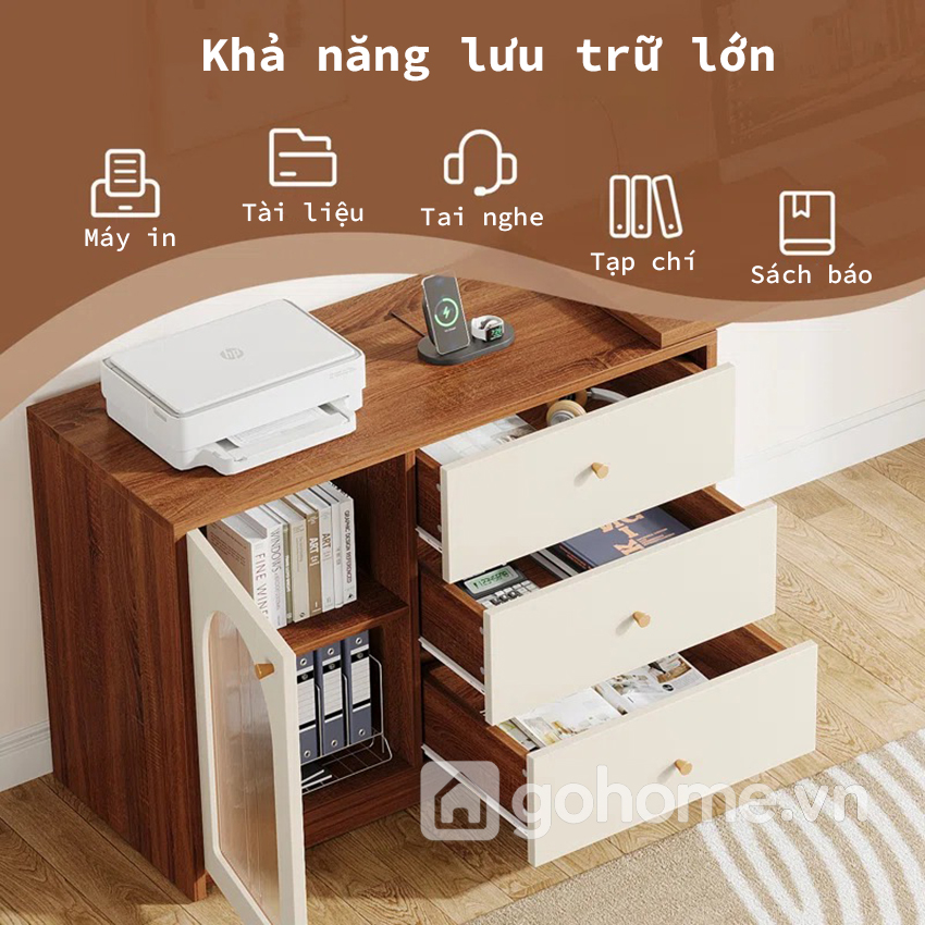 Điểm đặc biệt là khối tủ tích hợp vừa đóng vai trò chân bàn, vừa là không gian lưu trữ cực kỳ tiện lợi. Nhờ đó, bàn không chỉ là nơi đặt laptop, máy tính mà còn có thể dùng như: