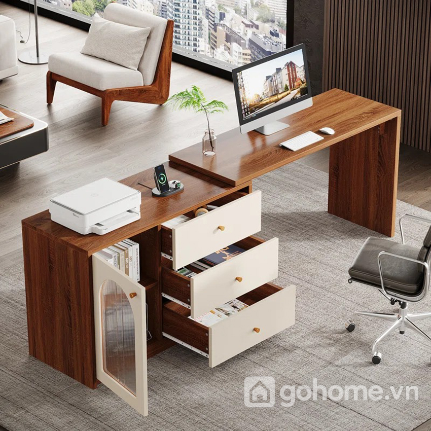Thiết kế này vừa tăng không gian lưu trữ, vừa giúp tổng thể bàn trông như một món nội thất cao cấp, không đơn thuần là bàn làm việc thông thường.