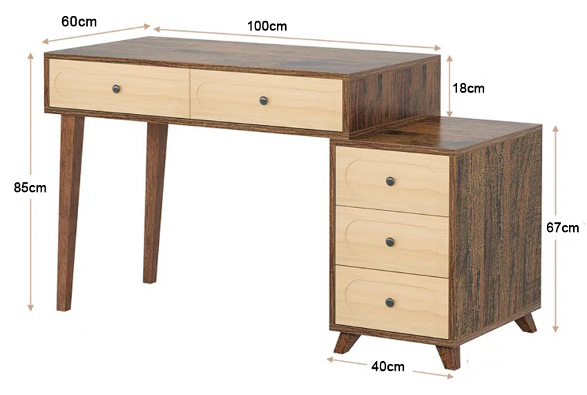 Gam màu vân gỗ nâu trầm kết hợp be sáng, đường nét bo cong nhẹ ở mặt ngăn kéo cùng dáng chân vững chắc tạo nên tổng thể vừa hiện đại, vừa ấm áp – rất phù hợp với xu hướng home office cao cấp, phòng làm việc tại nhà hoặc phòng ngủ có góc làm việc riêng.
