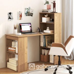 Mẫu bàn làm việc gỗ công nghiệp liền kệ sách được thiết kế theo dạng chữ L nhẹ, trong đó: