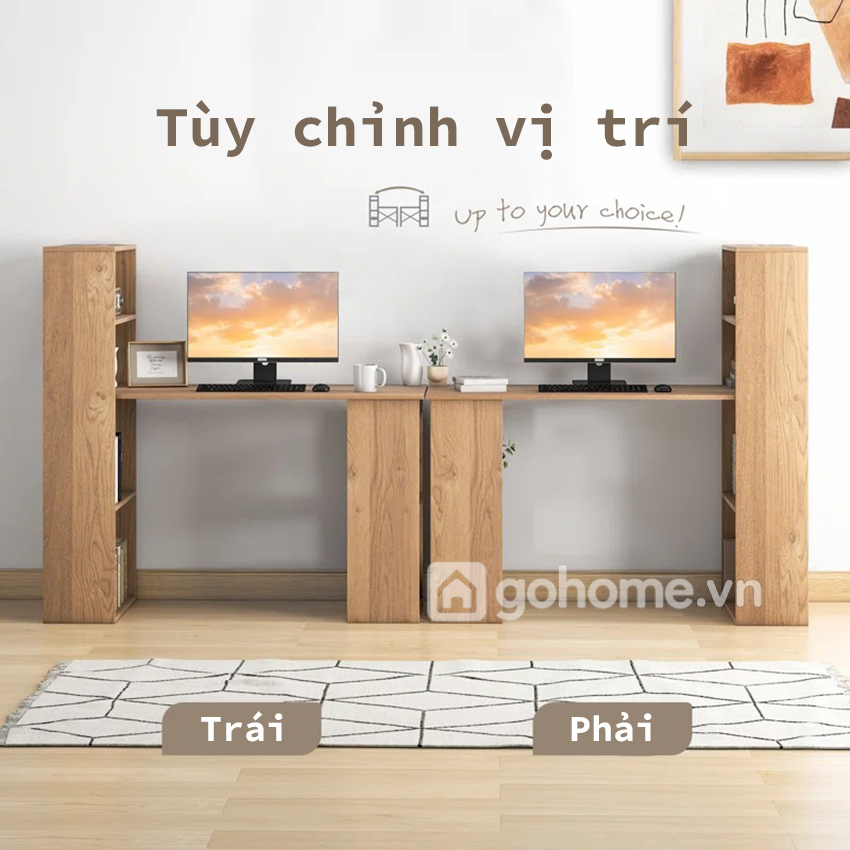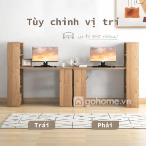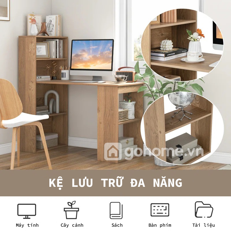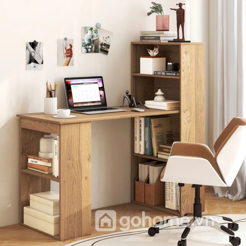 Cách bố trí này giúp người dùng dễ dàng lấy sách, sổ hoặc tài liệu mà không cần rời khỏi vị trí ngồi. Đồng thời, kệ sách đứng còn giúp không gian làm việc có chiều sâu hơn, trông gọn gàng và “có gu” hơn rất nhiều so với bàn làm việc trơn thông thường.