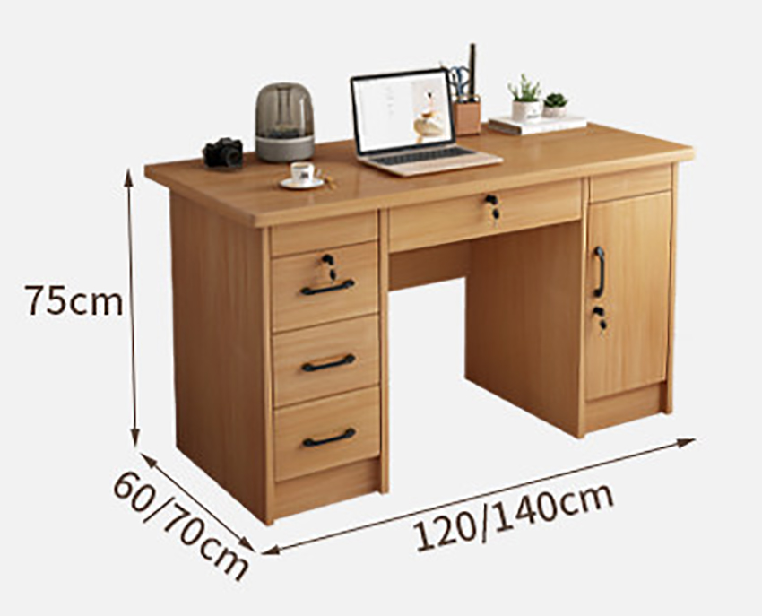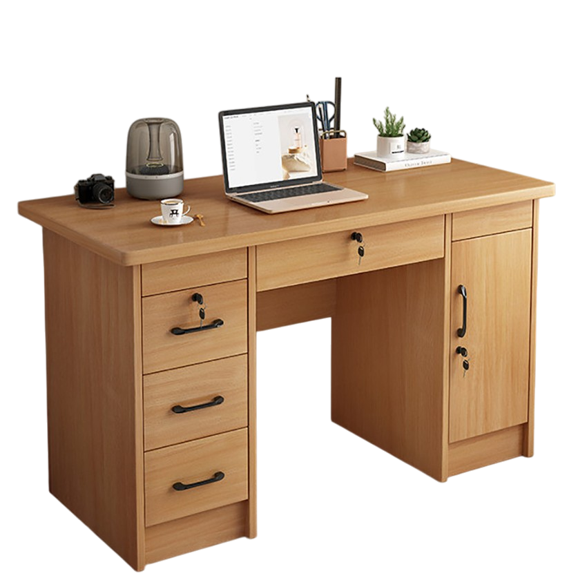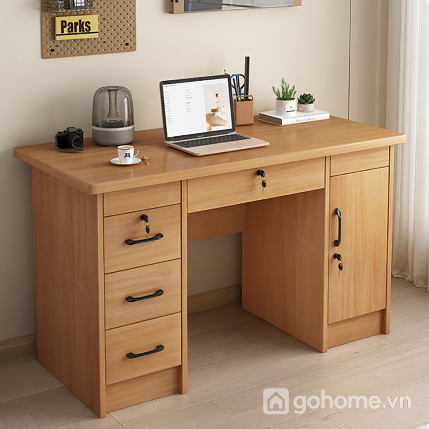 Chiếc bàn làm việc gỗ công nghiệp thiết kế tối giản mang phong cách hiện đại với đường nét vuông vức, chắc chắn nhưng không hề thô cứng. Tông màu gỗ sáng tự nhiên mang lại cảm giác ấm áp, gần gũi, giúp không gian làm việc trở nên dễ chịu và thư giãn hơn.
