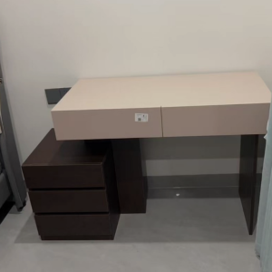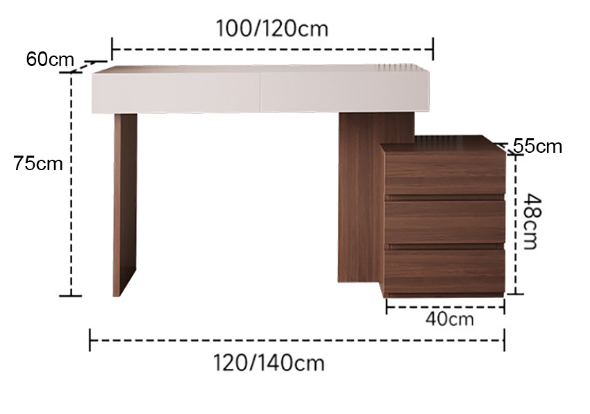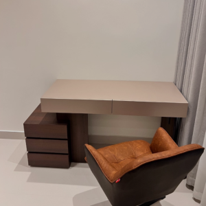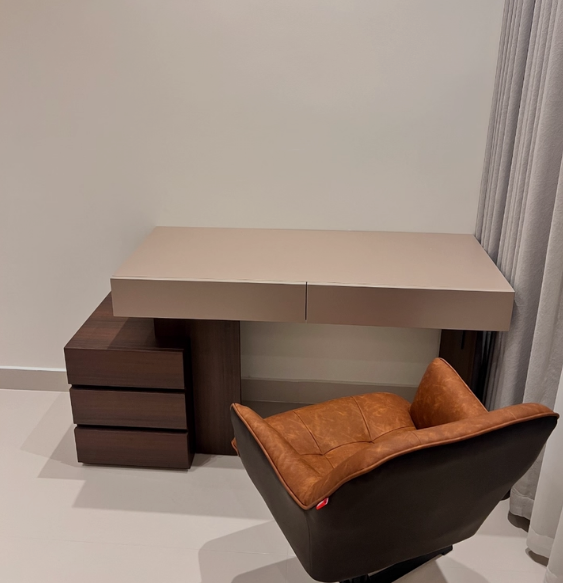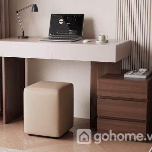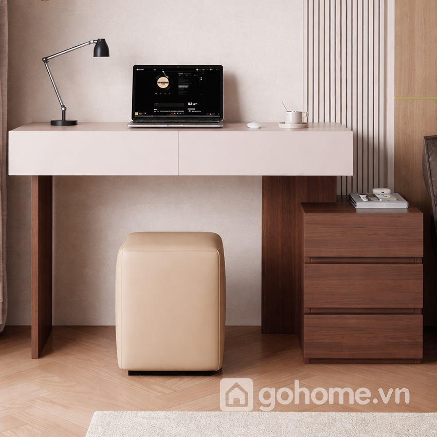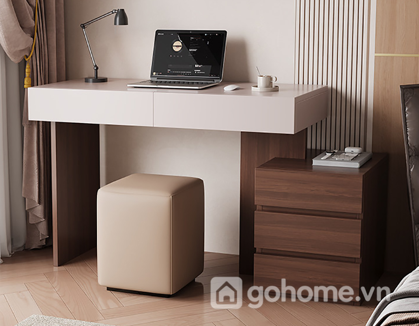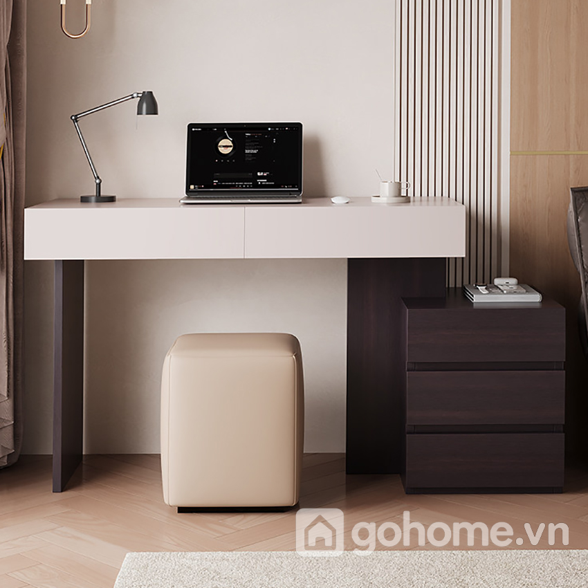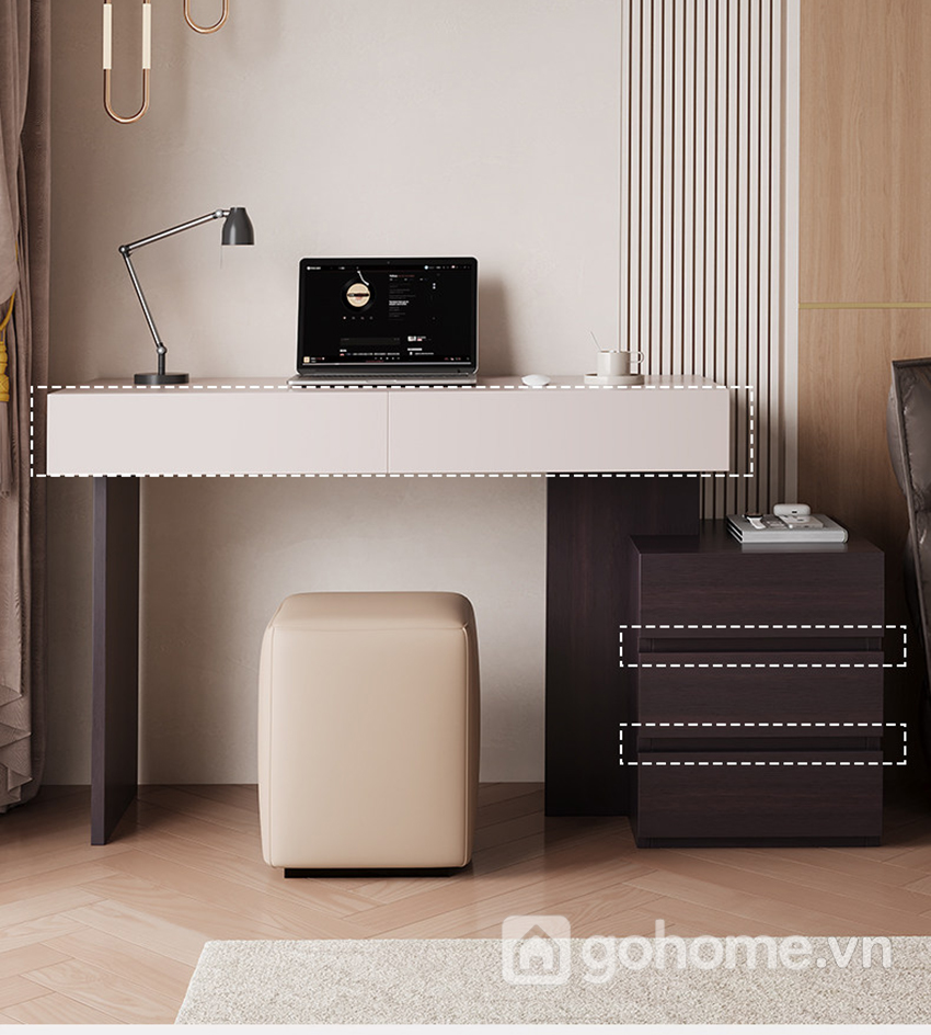Điểm đặc biệt nằm ở cấu trúc bàn: một bên chân dạng khối chắc chắn, bên còn lại kết hợp với tủ phụ rời giúp tăng tính linh hoạt trong sử dụng. Thiết kế này không chỉ mang tính thẩm mỹ cao mà còn tối ưu công năng, phù hợp với xu hướng nội thất hiện đại tối giản đang rất được ưa chuộng.