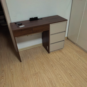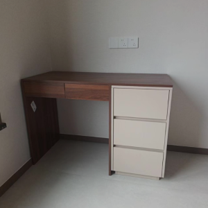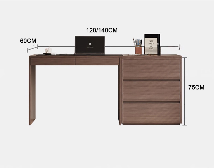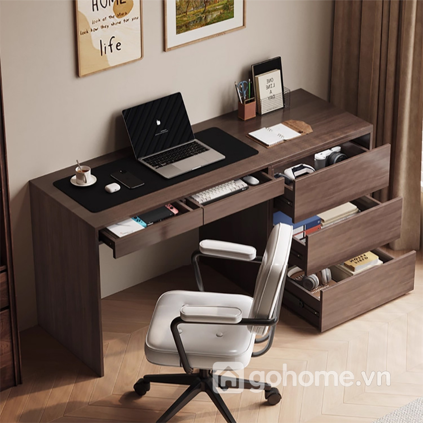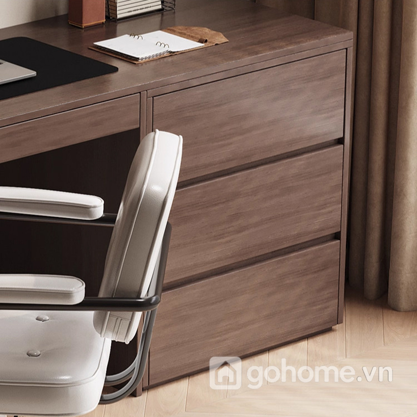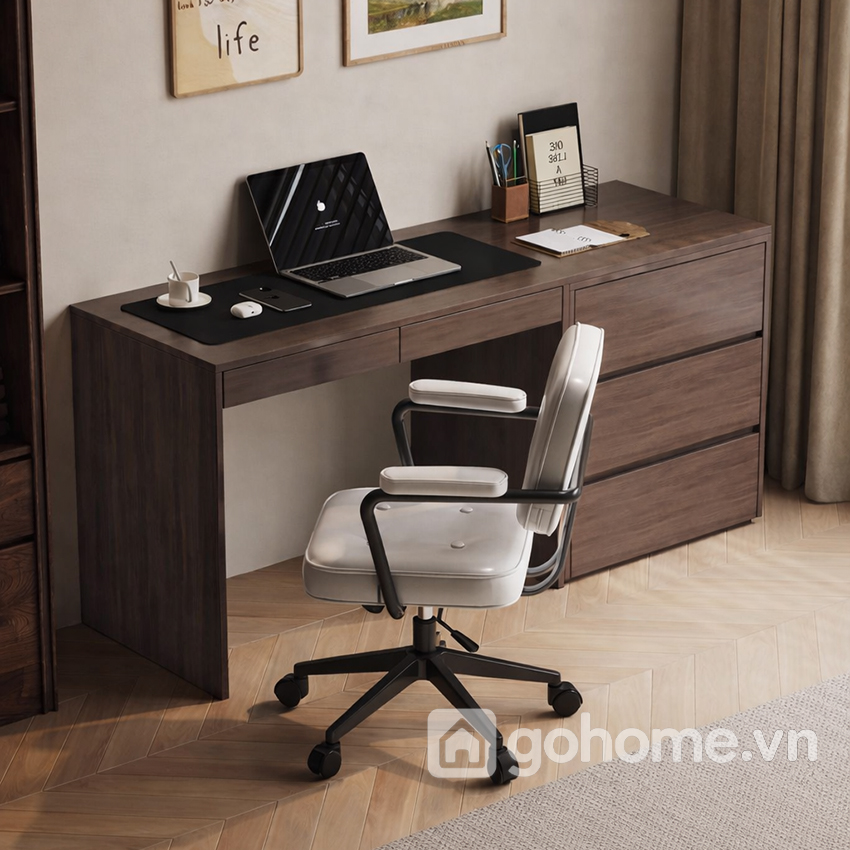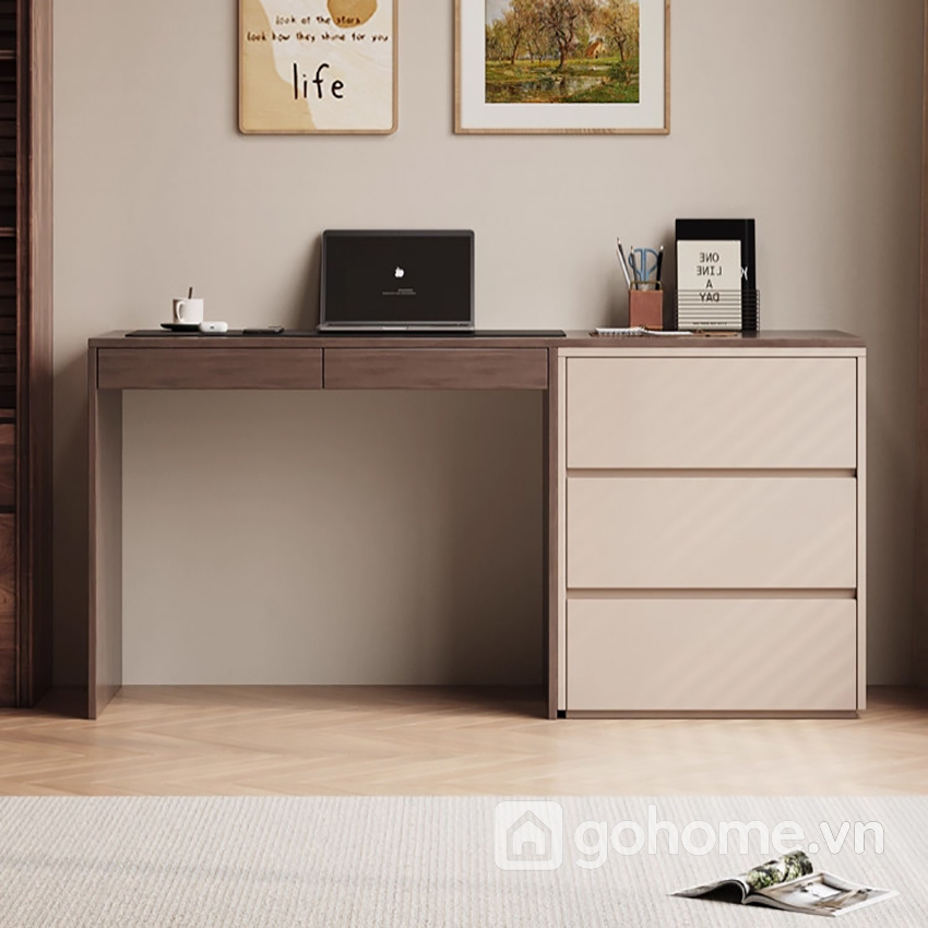 Thiết kế bàn dạng chữ nhật dài, tích hợp hộc tủ bên phải giúp tối ưu không gian lưu trữ mà không làm mất đi sự thanh thoát. Tông màu nâu gỗ kết hợp trắng kem mang lại cảm giác nhẹ nhàng, dễ phối với nhiều phong cách nội thất khác nhau như Scandinavian, Modern hay Japandi.