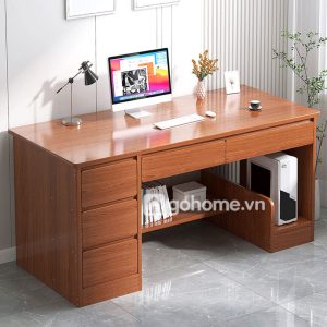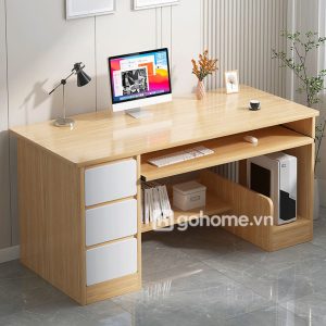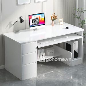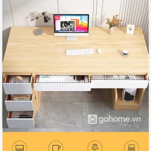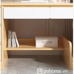 Bàn làm việc kèm kệ PC ở dưới mang đến sự tiện lợi cho mọi nhu cầu học tập và làm việc. Thiết kế gồm ngăn kéo rộng rãi, hộc để sách, cùng kệ PC riêng biệt – giúp không gian luôn gọn gàng, tránh tình trạng dây nhợ rối rắm.