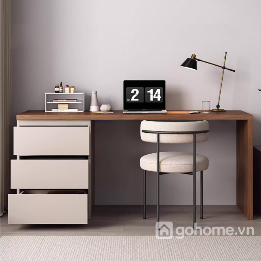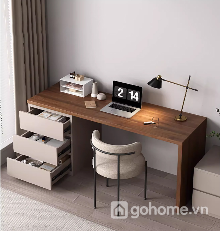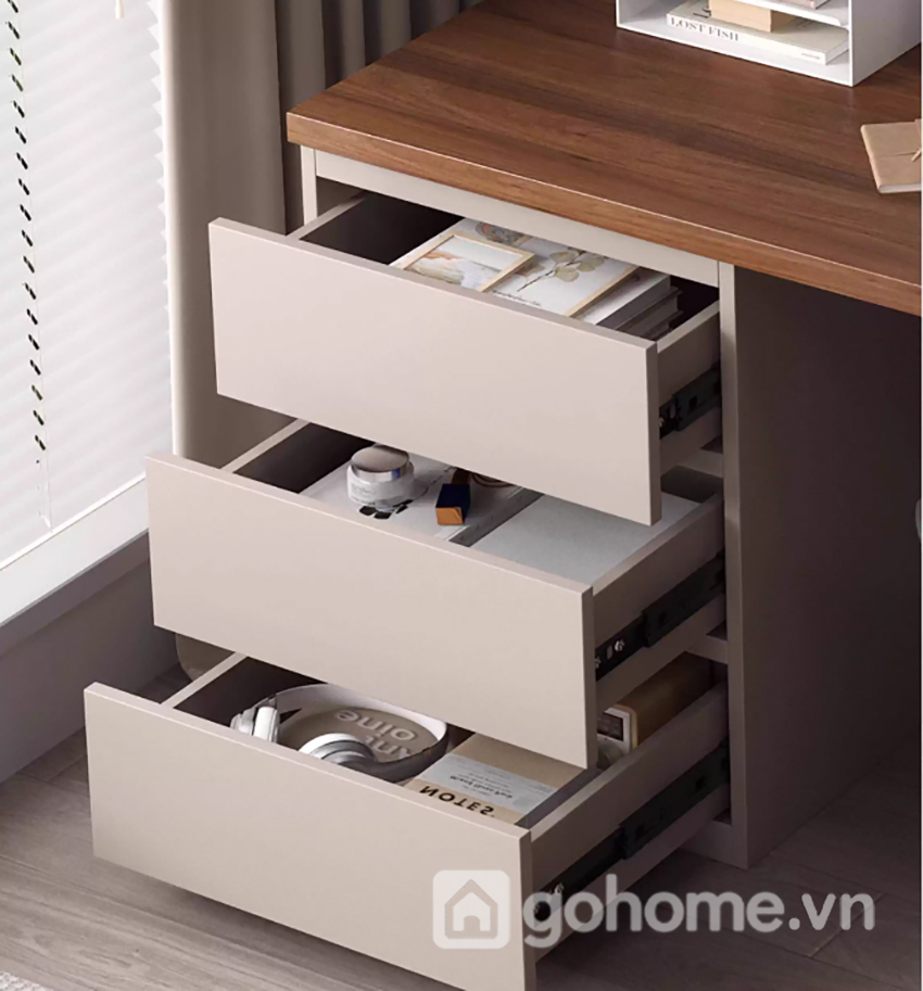Điểm cộng lớn nhất của sản phẩm chính là thiết kế tích hợp giữa bàn và tủ ngăn kéo. Thay vì phải mua riêng lẻ nhiều món nội thất, bạn chỉ cần một chiếc bàn là đã có đầy đủ công năng.