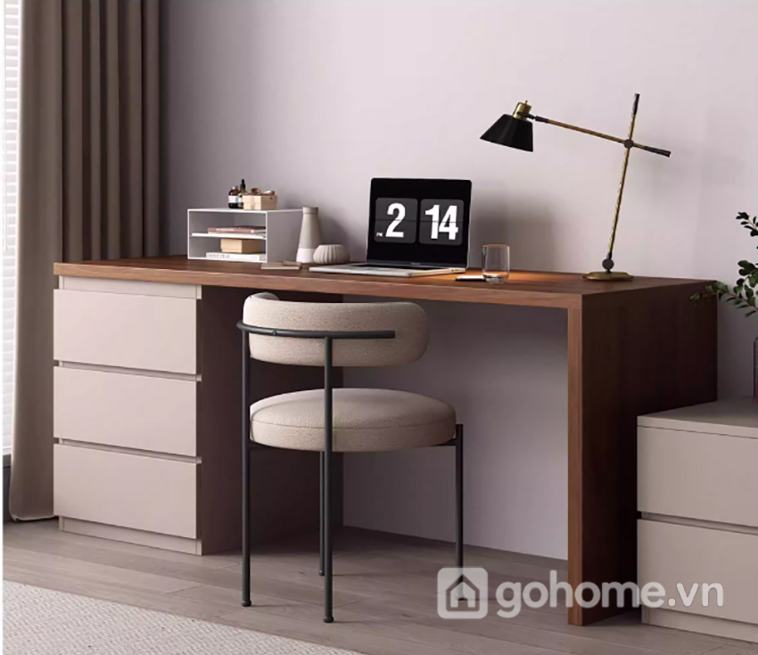 Chiếc Bàn Làm Việc Kèm Ngăn Kéo Tủ Tiện Lợi mang phong cách tối giản (Minimalism) đang rất được ưa chuộng hiện nay. Với sự kết hợp tinh tế giữa màu gỗ ấm áp và gam màu trung tính hiện đại, sản phẩm dễ dàng hòa hợp với nhiều phong cách nội thất khác nhau như Scandinavian, Contemporary hay Japandi.