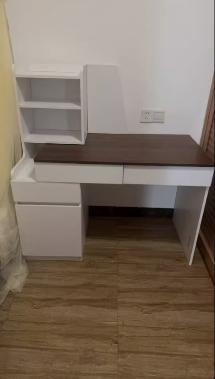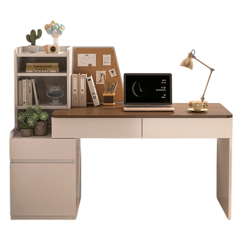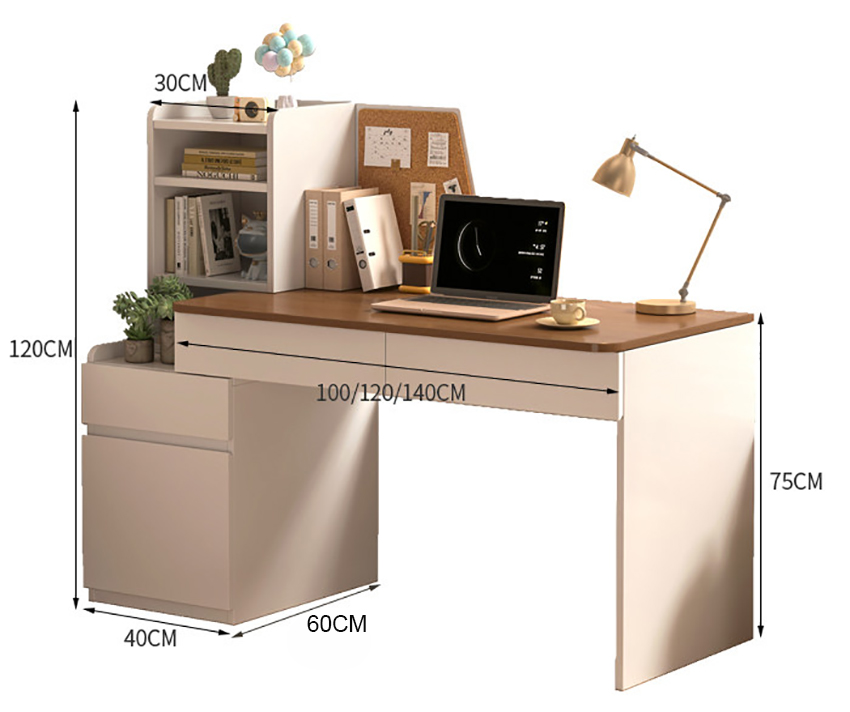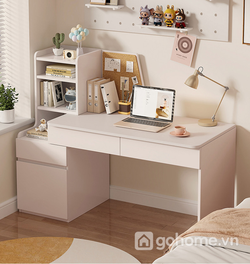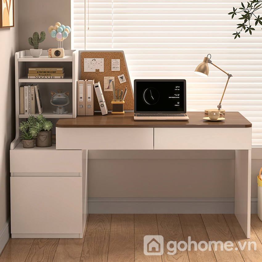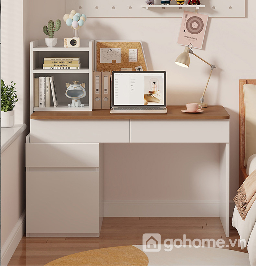 Tông màu trắng kem kết hợp mặt bàn vân gỗ nâu tạo nên sự hài hòa, dễ dàng phối hợp với nhiều phong cách nội thất khác nhau như Scandinavian, Modern hay Japandi. Đặc biệt, phần kệ sách tích hợp bên trái giúp tối ưu không gian theo chiều dọc – một giải pháp cực kỳ phù hợp cho những căn phòng nhỏ, căn hộ chung cư hoặc phòng ngủ cá nhân.