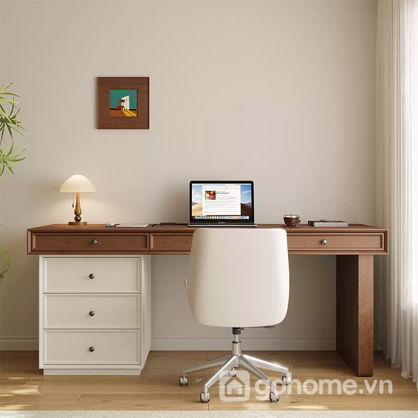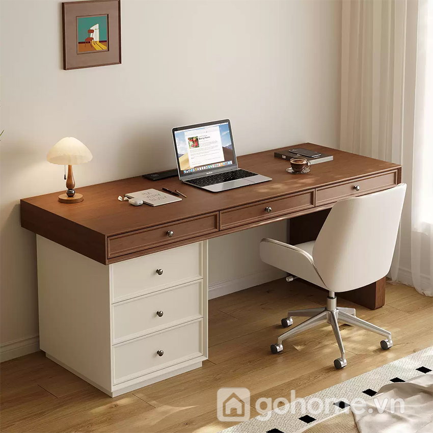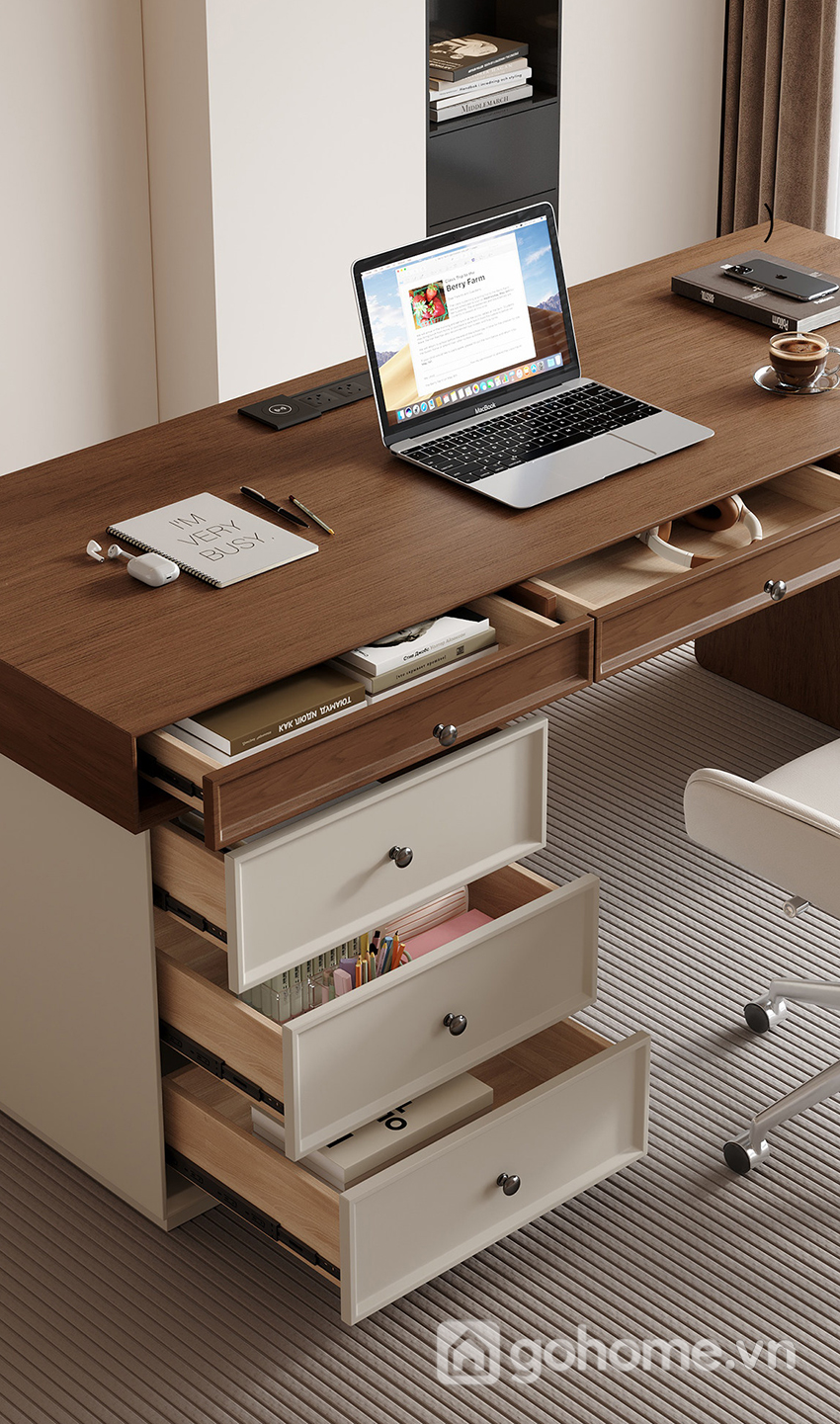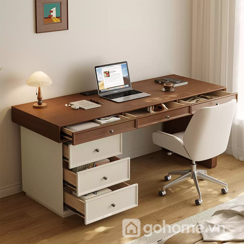Điểm nổi bật của sản phẩm chính là sự cân bằng giữa thẩm mỹ và công năng. Mặt bàn dài, rộng rãi cho phép bạn thoải mái làm việc, học tập hoặc sáng tạo. Bên dưới là hệ thống ngăn kéo và tủ giúp tối ưu hóa không gian lưu trữ mà vẫn đảm bảo tính gọn gàng.