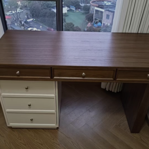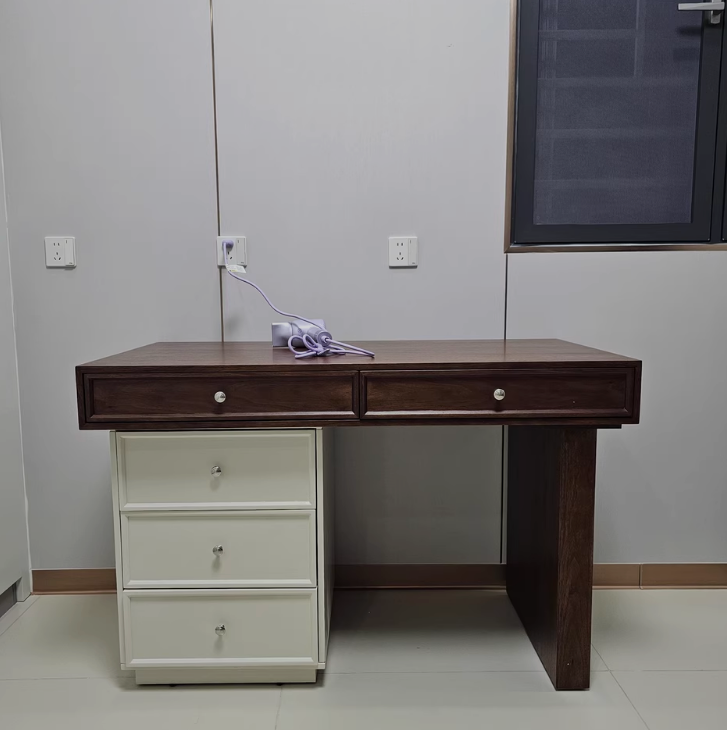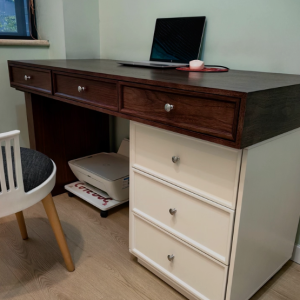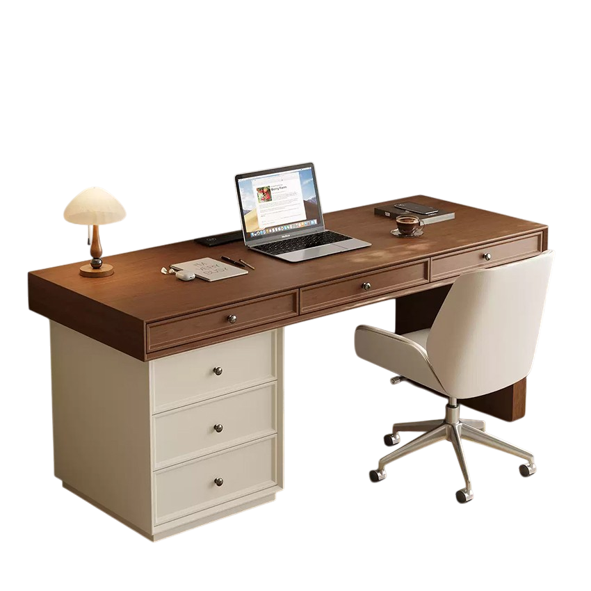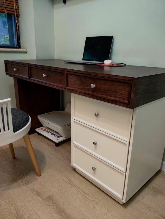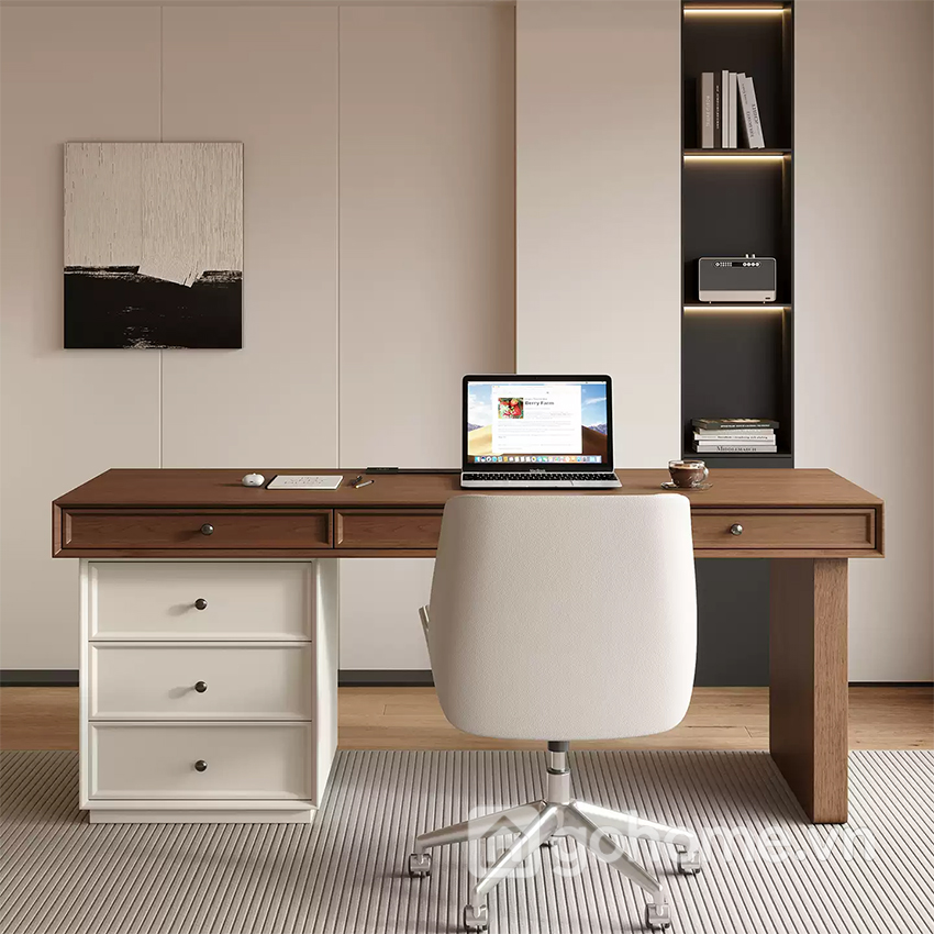 Chiếc bàn làm việc kết hợp ngăn kéo tủ kiểu dáng hiện đại mang phong cách tối giản nhưng không hề đơn điệu. Thiết kế hài hòa giữa hai gam màu: mặt bàn vân gỗ nâu ấm áp và phần tủ trắng tinh tế, tạo nên tổng thể thanh lịch, dễ dàng phù hợp với nhiều không gian nội thất.