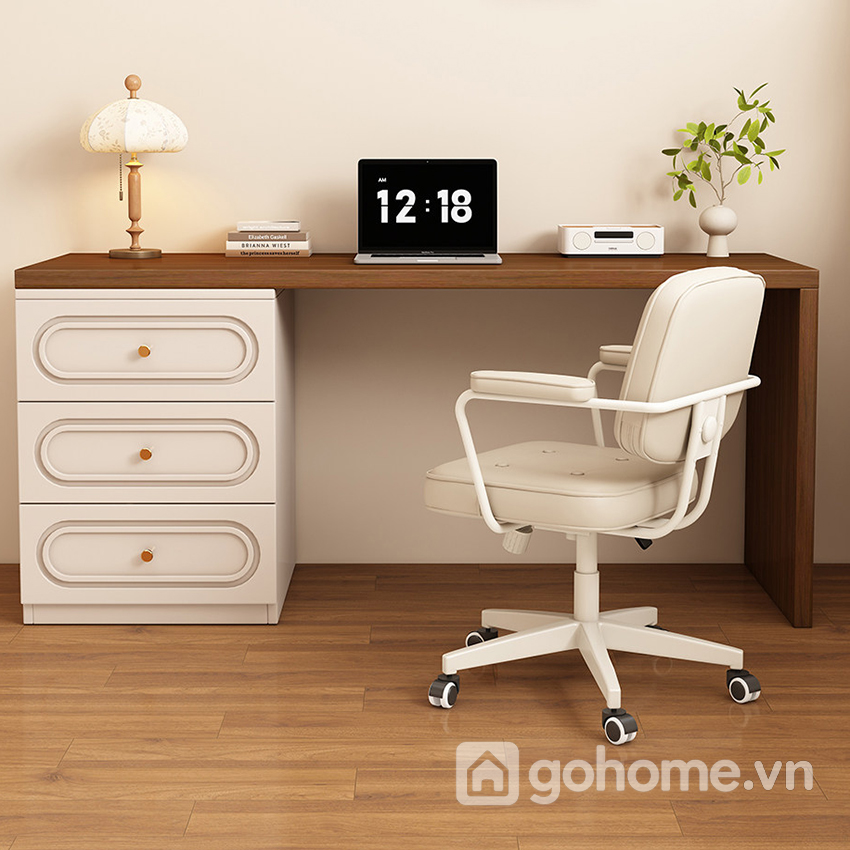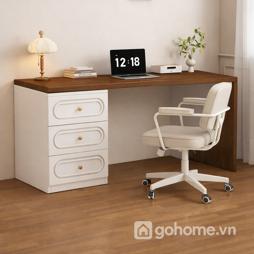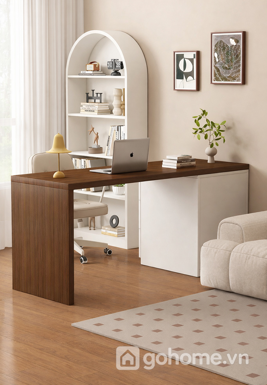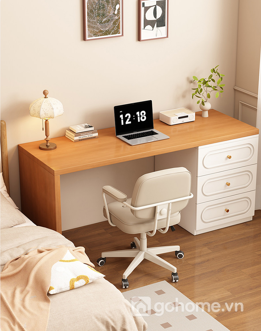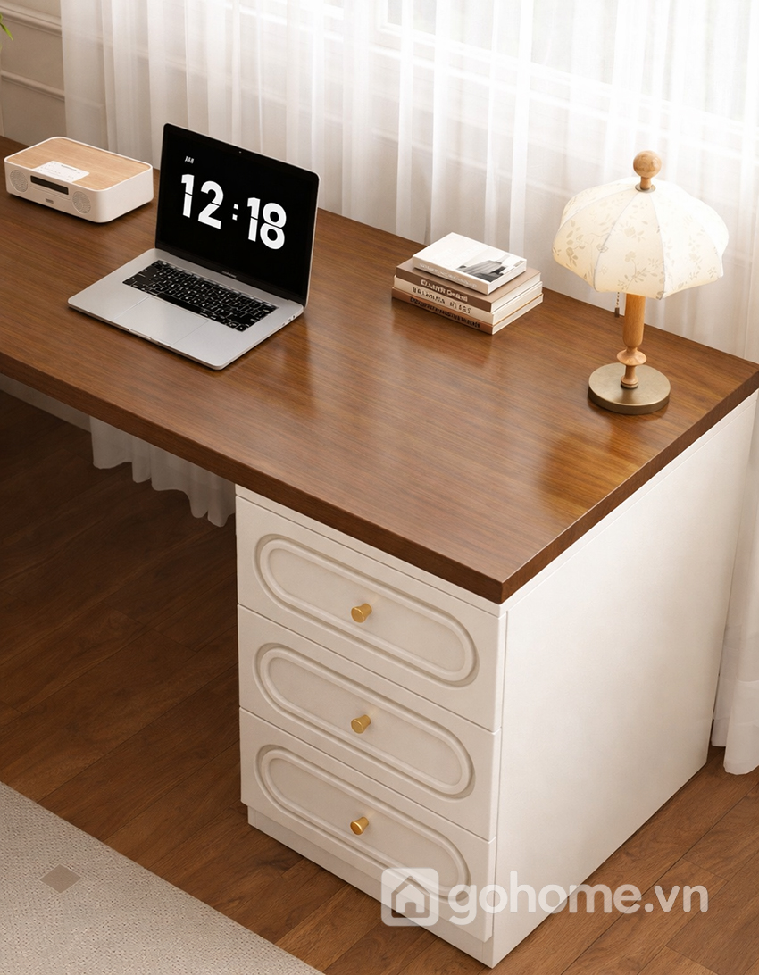 Chiếc bàn làm việc thiết kế đẹp gỗ công nghiệp trong hình mang phong cách hiện đại pha chút mềm mại, tinh tế. Sự kết hợp giữa mặt bàn vân gỗ sáng tự nhiên và phần tủ trắng bo góc nhẹ tạo nên tổng thể vừa thanh lịch vừa ấm áp.