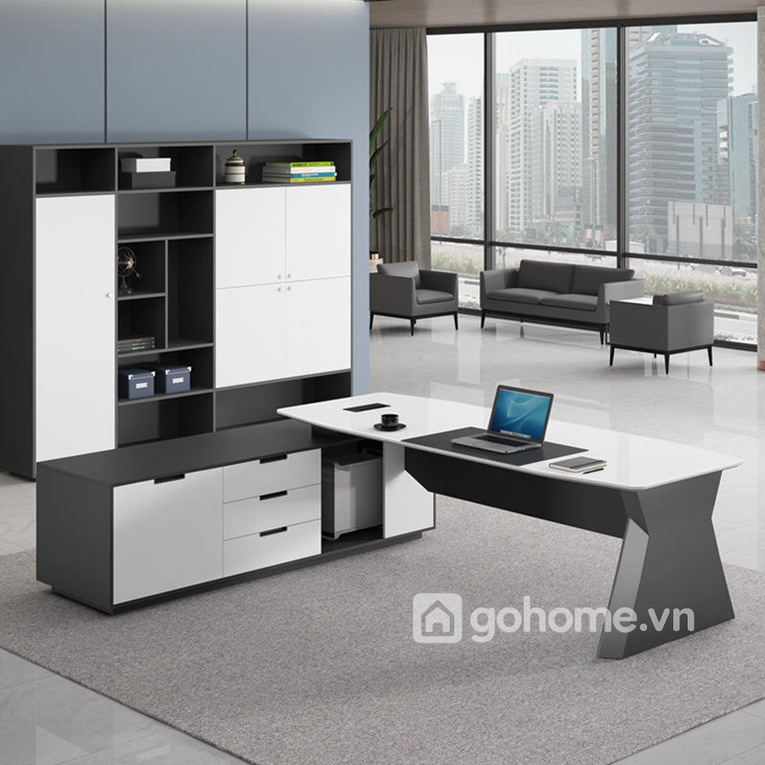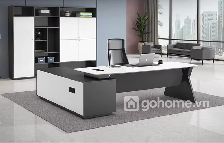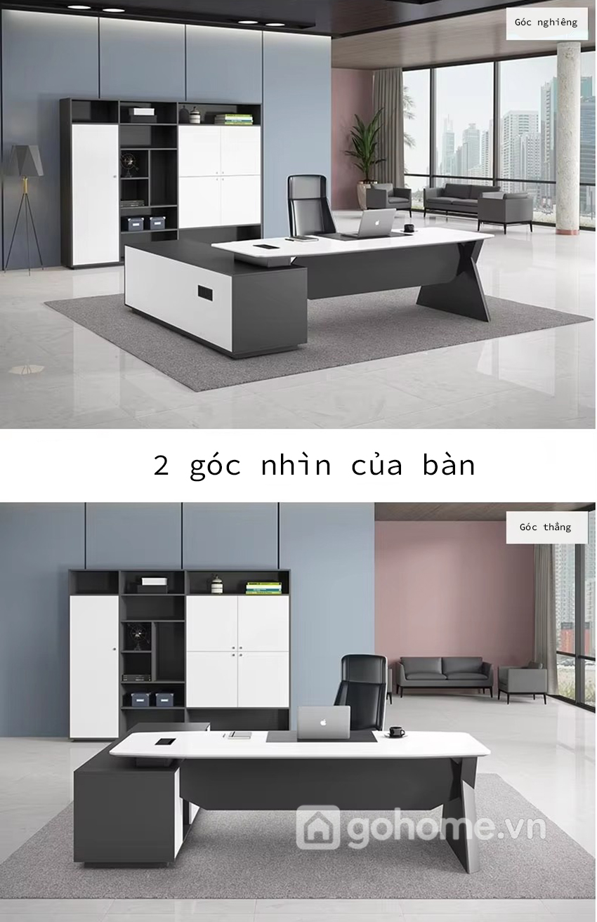 Phá vỡ mọi chuẩn mực truyền thống, chiếc bàn lãnh đạo hiện đại này mang đến cảm giác “công nghệ hóa” và trẻ trung nhờ thiết kế góc cạnh nhưng mềm mại, bố cục không đối xứng và tone màu tương phản trắng – đen đầy cuốn hút.