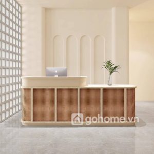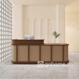 Tông gỗ tự nhiên kết hợp mây đan quá đẹp, kiểu này rất hiếm. Đặt ở sảnh lễ tân nhìn sáng không gian, tạo cảm giác thân thiện mà vẫn chuyên nghiệp.