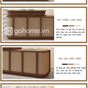 Quầy nhìn thực tế còn đẹp hơn hình! Màu gỗ sáng phối mây tự nhiên rất tinh tế, tạo cảm giác ấm cúng và sang trọng. Rất hợp cho không gian spa hay quán cà phê cao cấp.