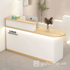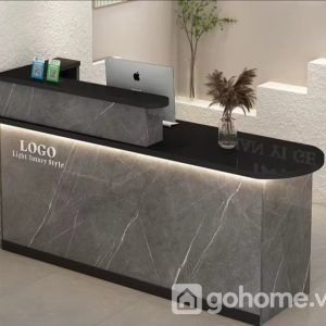 Thiết kế mặt bàn hai tầng thông minh, tầng trên được nâng nhẹ để đặt bảng hiệu hoặc logo doanh nghiệp, tầng dưới rộng rãi để sắp xếp máy tính, tài liệu và vật dụng văn phòng. Phần đèn LED viền ẩn nhẹ nhàng tỏa sáng, giúp không gian thêm phần sang trọng và hiện đại – tạo cảm giác thân thiện, chuyên nghiệp cho khách hàng khi bước vào.