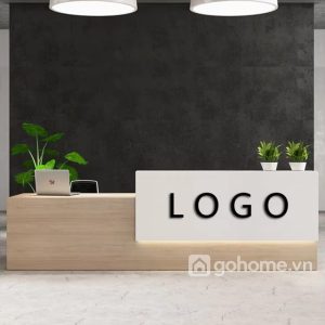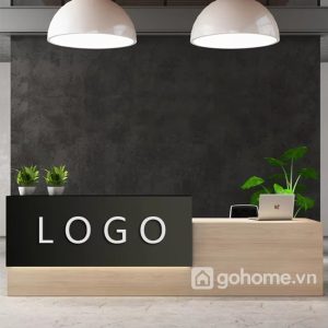 Phần mặt trước được nhấn bằng bảng logo nổi bật trên nền đen mờ sang trọng, giúp tăng khả năng nhận diện thương hiệu và tạo điểm nhấn thị giác mạnh mẽ trong không gian. Bề mặt bàn rộng rãi cho phép bố trí máy tính, điện thoại, hồ sơ và vật trang trí một cách gọn gàng, ngăn nắp.