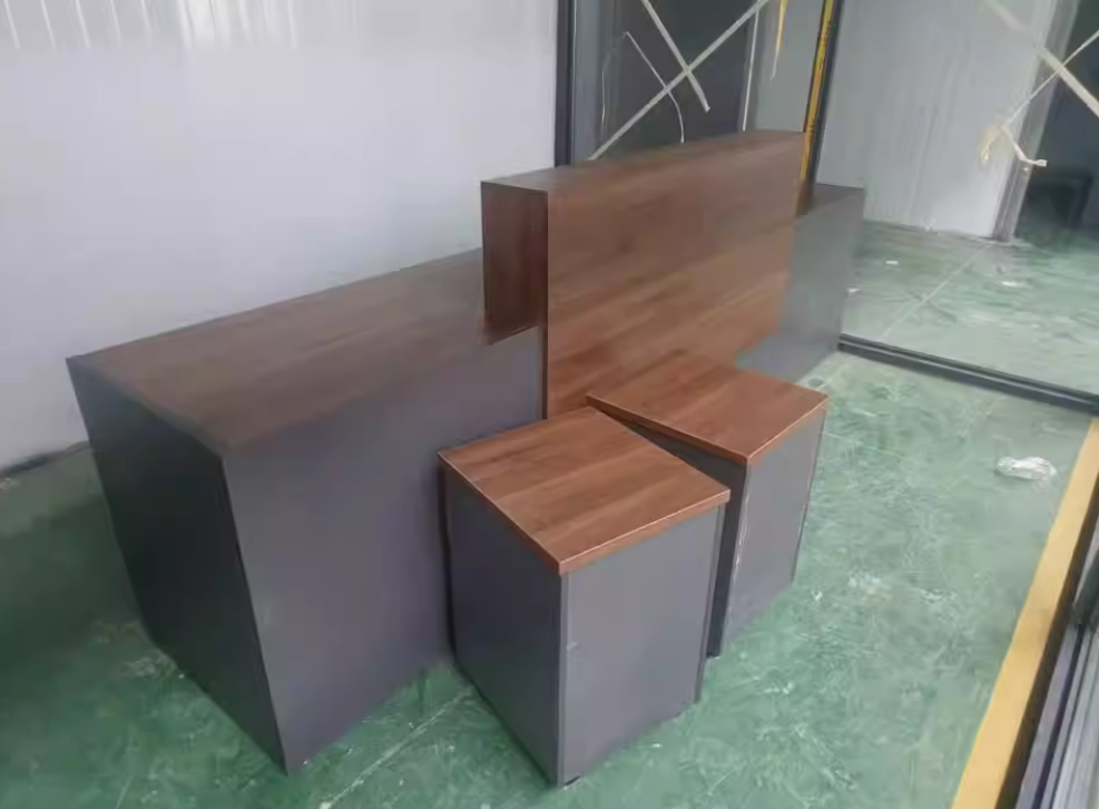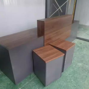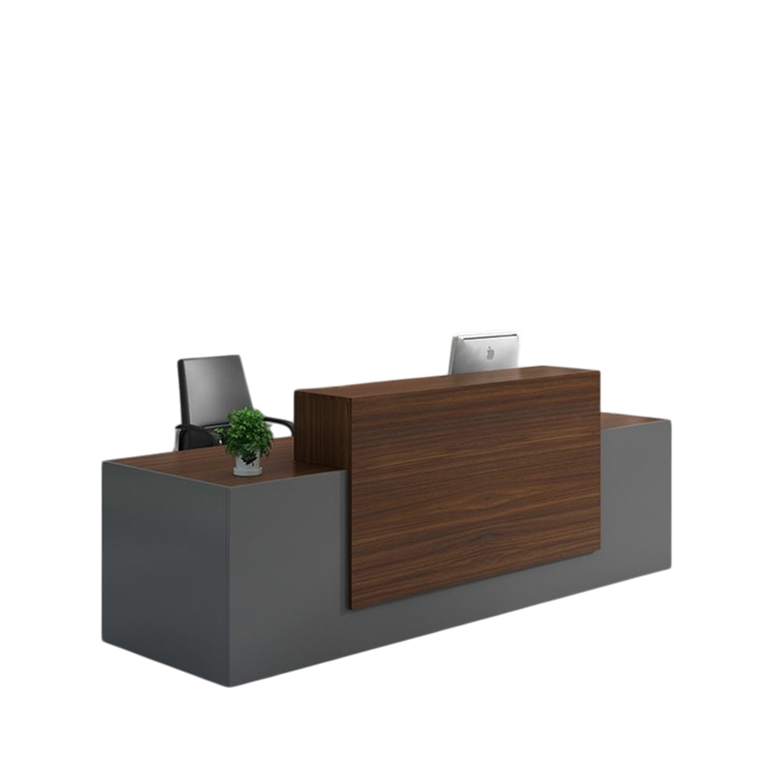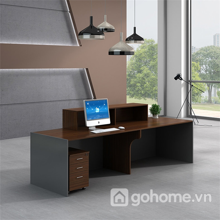 Điểm nổi bật của sản phẩm nằm ở sự kết hợp màu sắc tinh tế: vân gỗ nâu trầm mang đến cảm giác ấm áp, chuyên nghiệp; trong khi gam xám trung tính lại tạo nên sự cân bằng hiện đại, cực kỳ “trendy”. Tổng thể tạo nên một chiếc quầy lễ tân hiện đại cao cấp vừa sang vừa gần gũi.