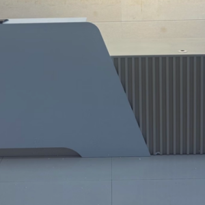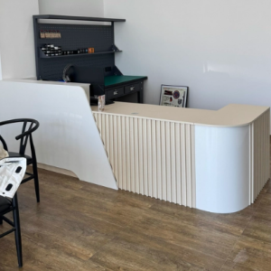 Lấy cảm hứng từ phong cách tối giản đương đại, mẫu bàn quầy trong hình sở hữu những đường nét bo cong mềm mại kết hợp mảng ốp lam sóng nổi bật phía trước. Gam màu trắng thanh lịch phối cùng ánh đèn hắt chân bàn tạo hiệu ứng thị giác sang trọng, giúp không gian trở nên sáng bừng và chuyên nghiệp hơn bao giờ hết. Đây không chỉ là nơi đón tiếp khách mà còn là điểm nhấn kiến trúc giúp văn phòng “ghi điểm” tuyệt đối.