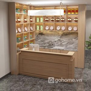 Khi kết hợp cùng ánh sáng vàng ấm hoặc cây xanh, bàn thu ngân trở thành điểm nhấn nổi bật trong không gian.