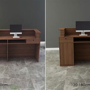 Điểm nổi bật của mẫu bàn là phần khung nổi ở mặt trước, tạo chiều sâu và sự sang trọng nhẹ nhàng cho tổng thể. Thiết kế bậc cao phía trên vừa che chắn khu vực làm việc của nhân viên, vừa giúp không gian quầy trở nên chuyên nghiệp hơn khi tiếp khách.