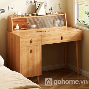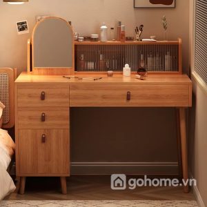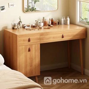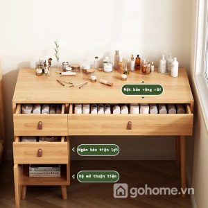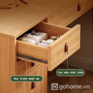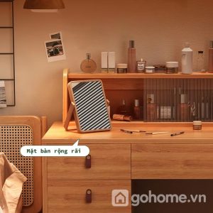 Điểm nhấn ấn tượng của sản phẩm là ngăn chứa đồ thông minh có cửa trượt nhựa mờ độc đáo, giúp bảo vệ mỹ phẩm khỏi bụi bẩn mà vẫn giữ được nét thẩm mỹ tinh tế. Phần mặt bàn rộng vừa đủ, thoải mái đặt gương, mỹ phẩm và phụ kiện làm đẹp. Dưới mặt bàn là ngăn kéo và tủ nhỏ tiện lợi, giúp sắp xếp đồ gọn gàng, tiết kiệm tối đa diện tích cho căn phòng.