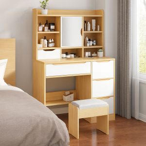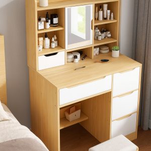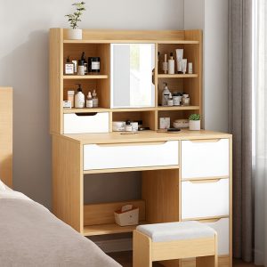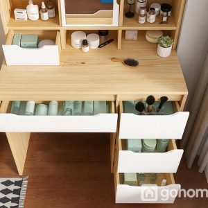 Bàn được trang bị nhiều ngăn kéo và kệ mở, giúp bạn dễ dàng phân loại mỹ phẩm, nước hoa, trang sức. Phần gương lớn được thiết kế tinh tế, mang đến sự thuận tiện khi trang điểm và làm tóc. Đặc biệt, kiểu dáng gọn gàng phù hợp với cả phòng ngủ nhỏ hay căn hộ chung cư.