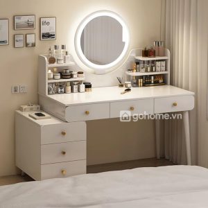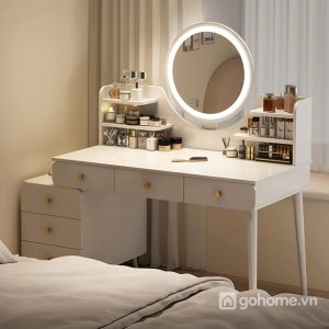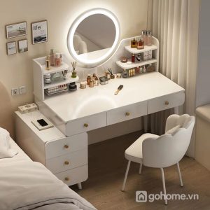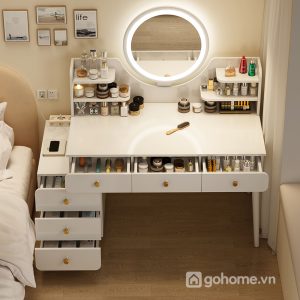 Điểm nhấn ấn tượng nhất nằm ở gương tròn LED cảm ứng hiện đại, ánh sáng dịu nhẹ giúp bạn dễ dàng trang điểm dù là sáng sớm hay buổi tối. Phía dưới mặt bàn là hệ thống nhiều ngăn kéo tiện dụng – từ ngăn lớn để mỹ phẩm, máy sấy tóc, cho đến ngăn nhỏ để phụ kiện, nước hoa hay đồ trang sức.