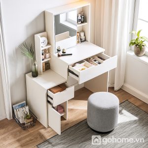 Bàn trang điểm nhỏ tiện lợi được làm từ chất liệu gỗ MDF phủ Melamine bền đẹp, chống trầy xước, dễ lau chùi. Điểm đặc biệt của bàn là thiết kế nhiều hộc kéo và ngăn chứa thông minh, cho phép bạn sắp xếp mỹ phẩm, nước hoa, phụ kiện hay đồ skincare một cách ngăn nắp.